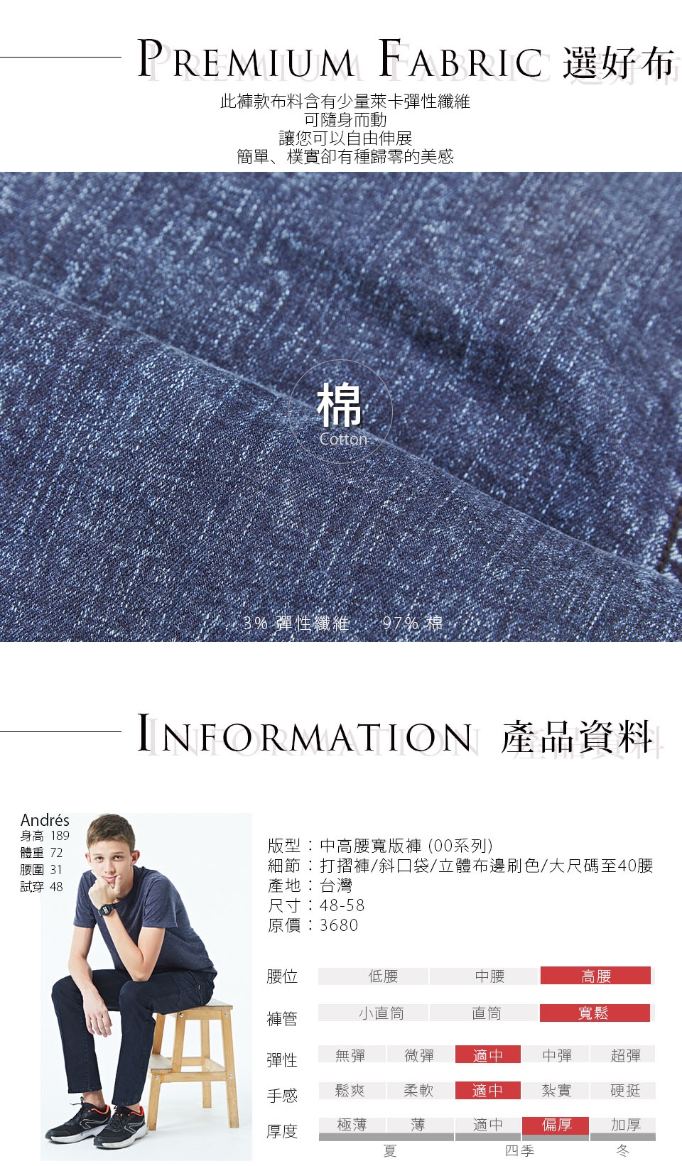 我們的堅持在於使用好的材質、簡單設計,不斷的開發順應時代潮流 開創出屬於成熟男性的自我風格,每一季穩定設計多樣化的褲款