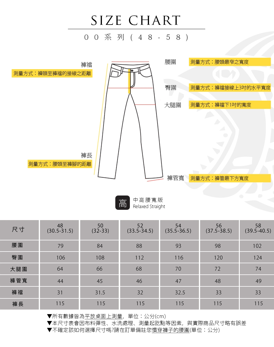 E.水洗後會有2-3%縮率,此為正 常現象,在修改褲長時請稍微增長褲長;此外,為了防止縮水,請勿使用烘乾機烘乾衣物。
