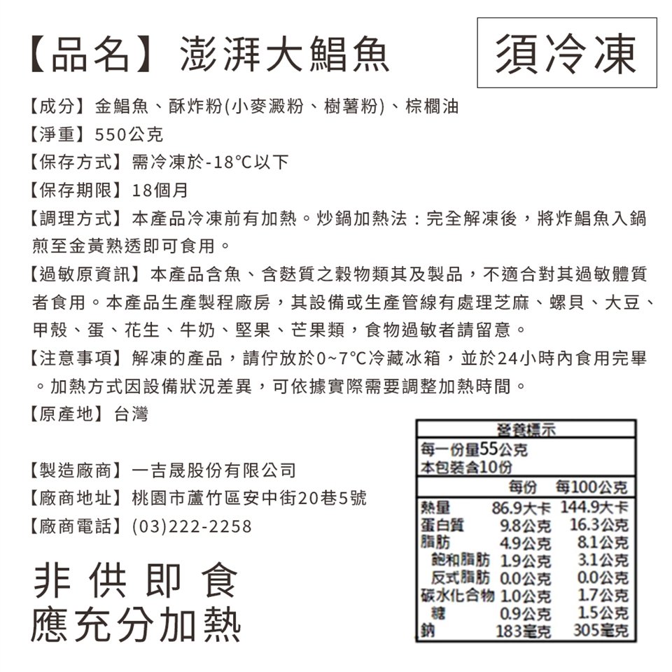 ※ 若部分商品為生鮮冷凍出貨 (例如:魚類/海鮮..等),提醒您需完全加熱至熟之後方能食用。