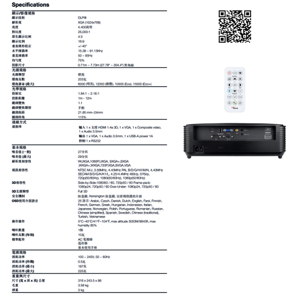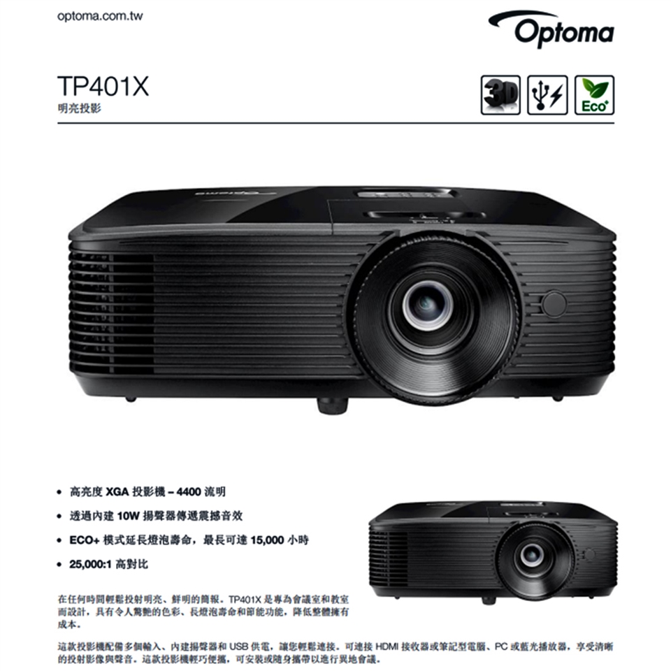 Optoma TP401X XGA多功能投影機是中型會議或教室空間的最佳選擇,在開燈或觀看動態影片的情況下仍能擁有絕佳的視覺體驗,適用所有投影情境。