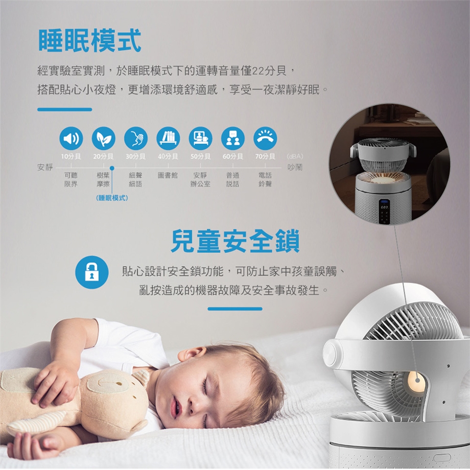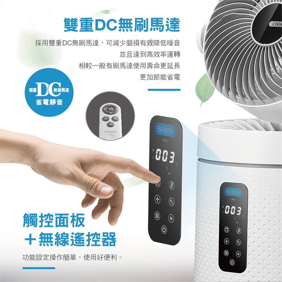 電子式觸控開關:含電源開關、風速選擇、兒童安全鎖/夜燈、濾網更換提醒、模式選擇、擺頭方向、PM2.5智能偵測