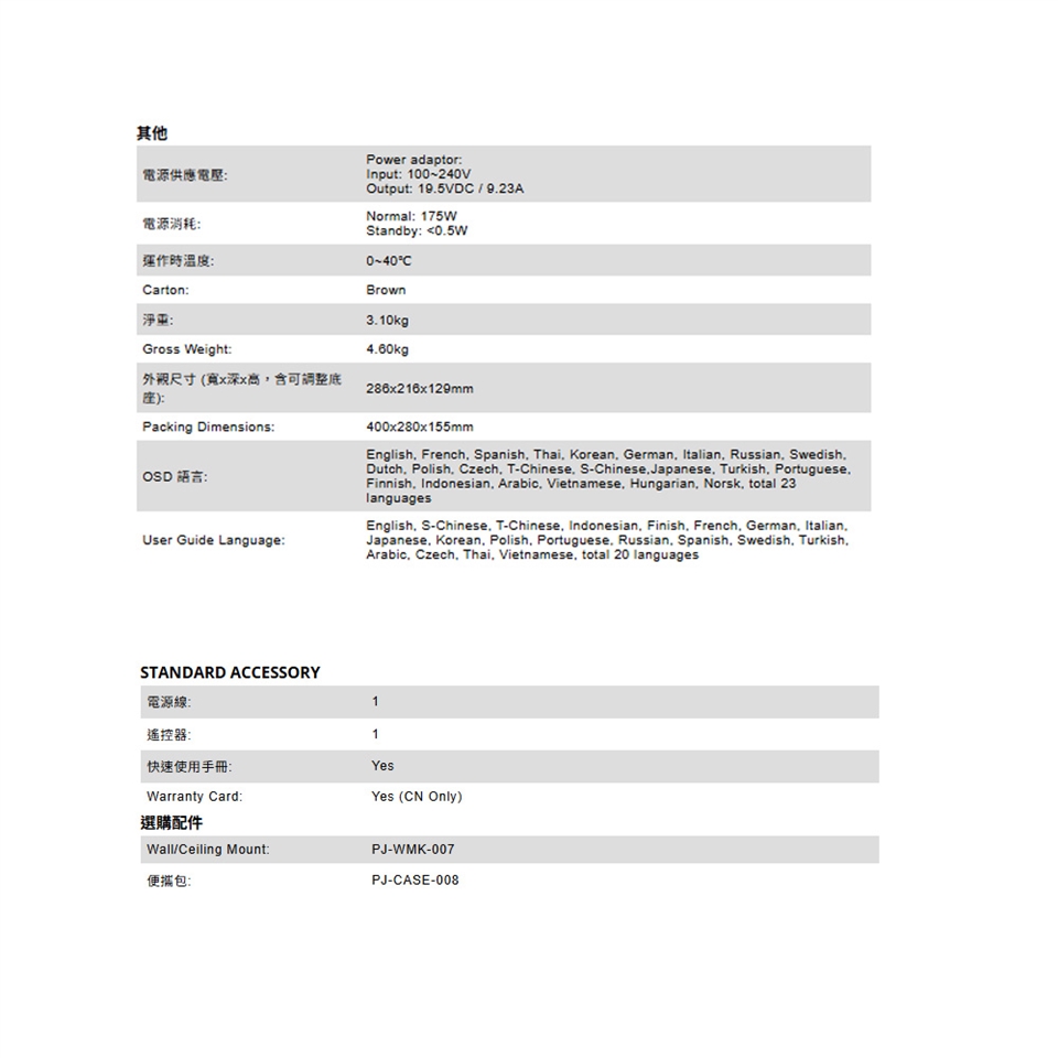 -外觀尺寸 (寬x深x高,含可調整底座): 286x216x129mm