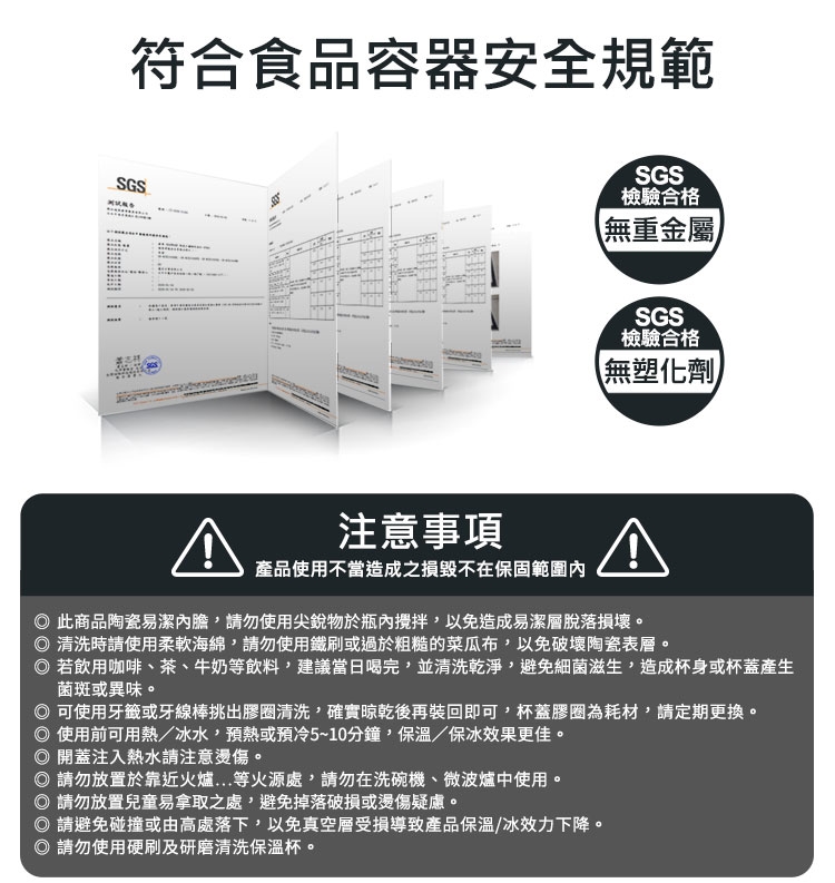 ※ 請勿將金屬湯匙、筷子或尖銳物品放置杯內碰撞瓶身,以免陶瓷內層受損。