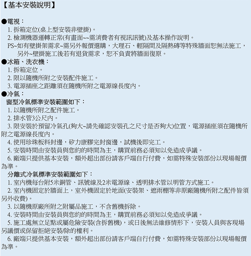 ◎ 本商品含基本安裝(基本安裝以未拆封可搬運至產品定位及隨機所附配件安裝,確認運作正常為準),偏遠地區費用另計(依廠商報價為主)。