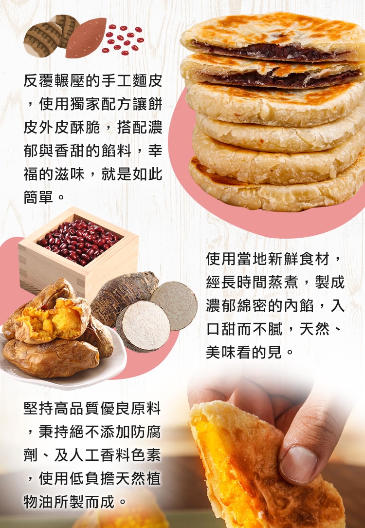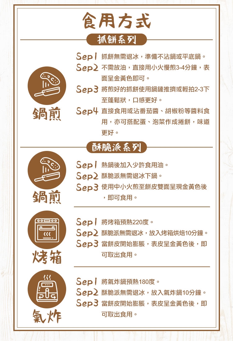 商品詳細介紹 體驗說明 不可體驗 使用方法說明 本產品不必解凍。將平底鍋熱鍋後,加入少許的油,將餅放入鍋中煎至兩面呈金黃色即可食用。 注意事項 本產品含有麩質之穀物及其製品(小麥)、黃豆及其製品,不適合對其過敏體質者食用。