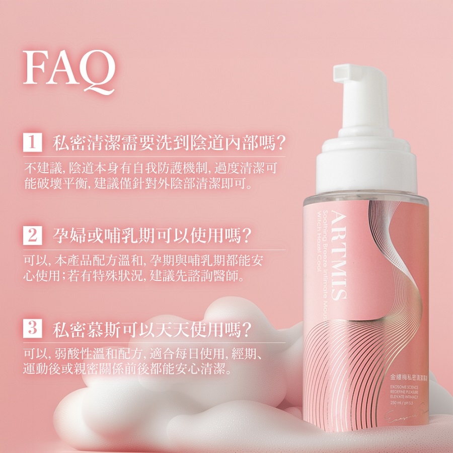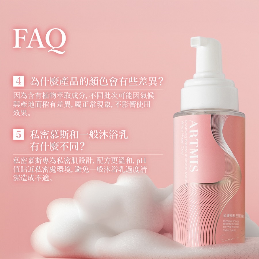 使用方式:取適量慕斯泡沫,清潔私密部位肌膚,再用清水洗淨