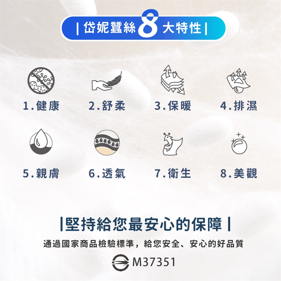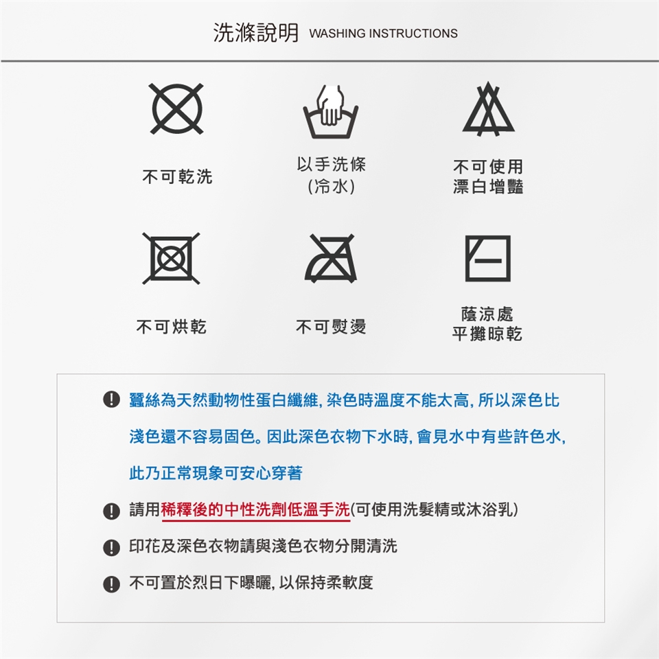 ► 請避免於太陽直射處曝曬,避免蠶絲纖維損壞。