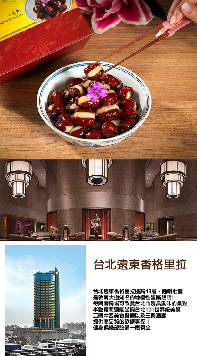 精挑細選大顆紅棗,填入軟糯麻糬一同蒸煮後,再淋上戴著百花香氣的糖水。