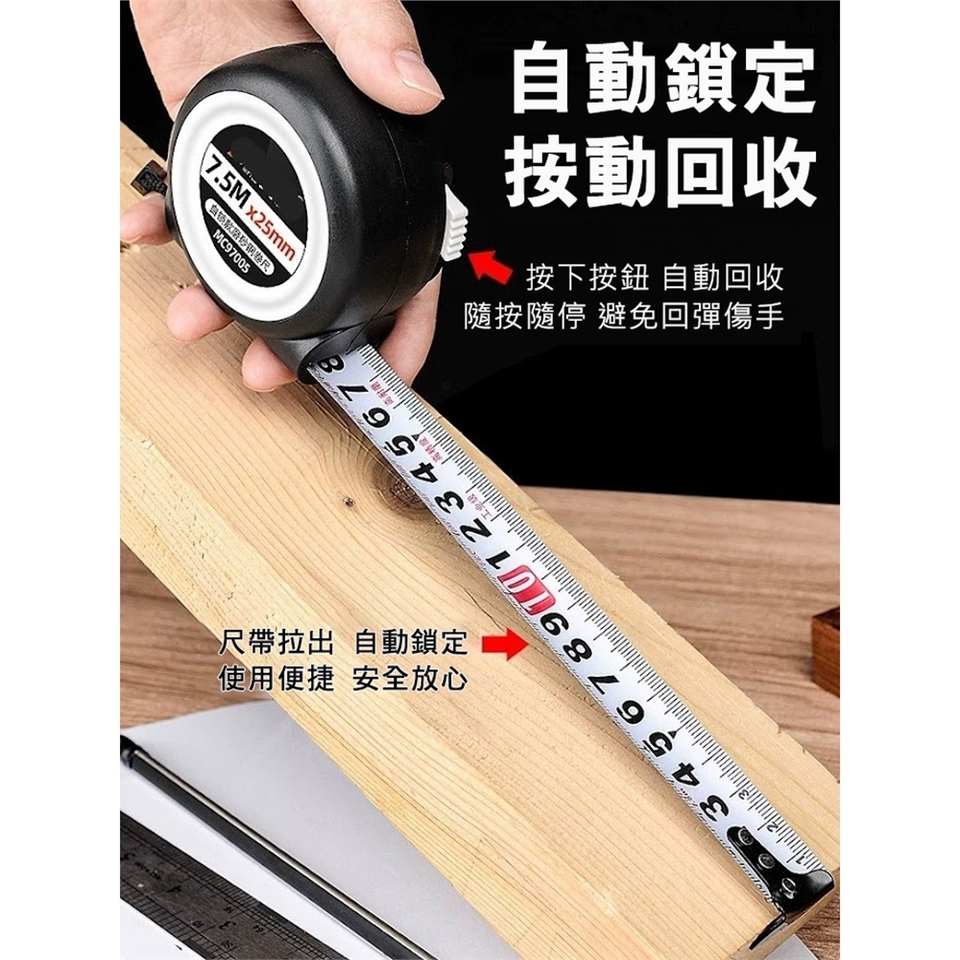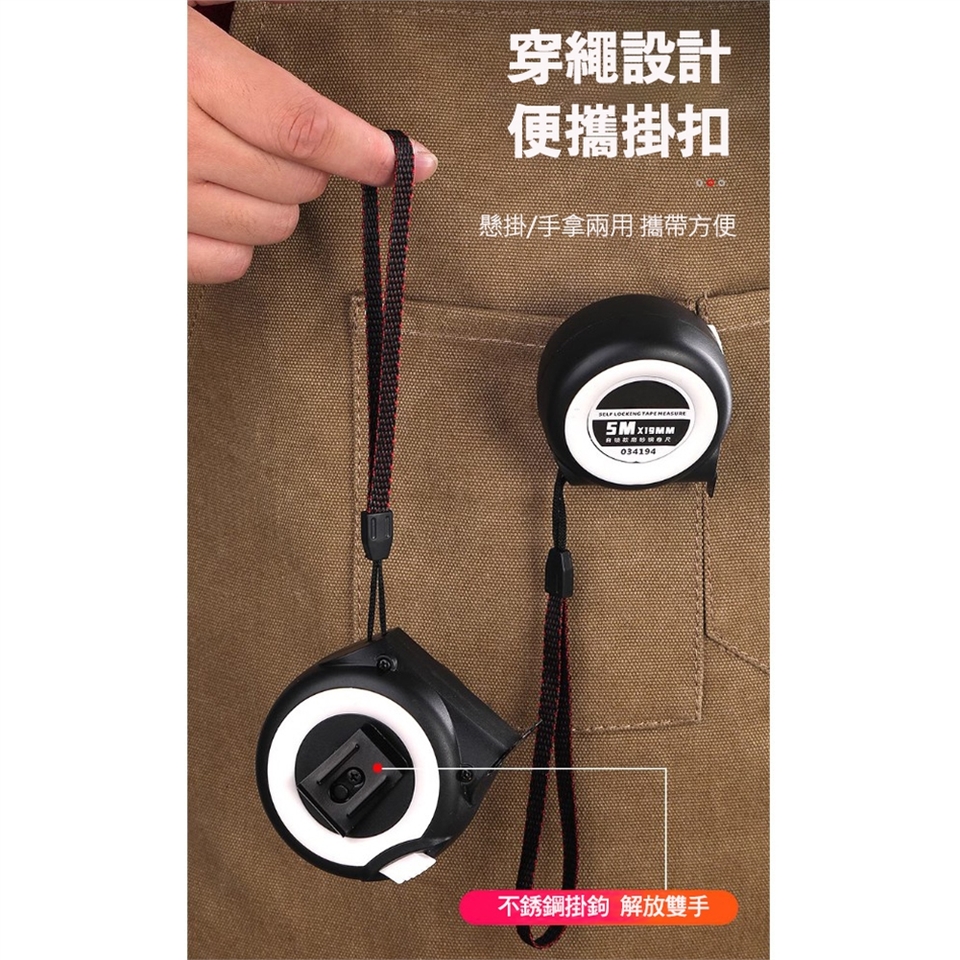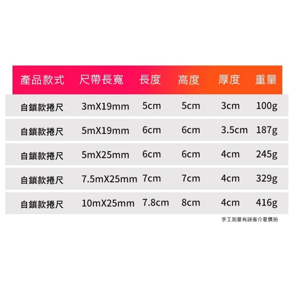 公制JIS標準,一級精準尺帶,支援勾量、頂量,高碳鋼芯材,三層工藝,耐磨防鏽防滑防割,自動鎖定功能,尺帶停止拉伸時,將自動卡住固定,堅固水平挺直2.4米不掉落,配有不鏽鋼掛勾及尼龍掛繩,攜帶方便