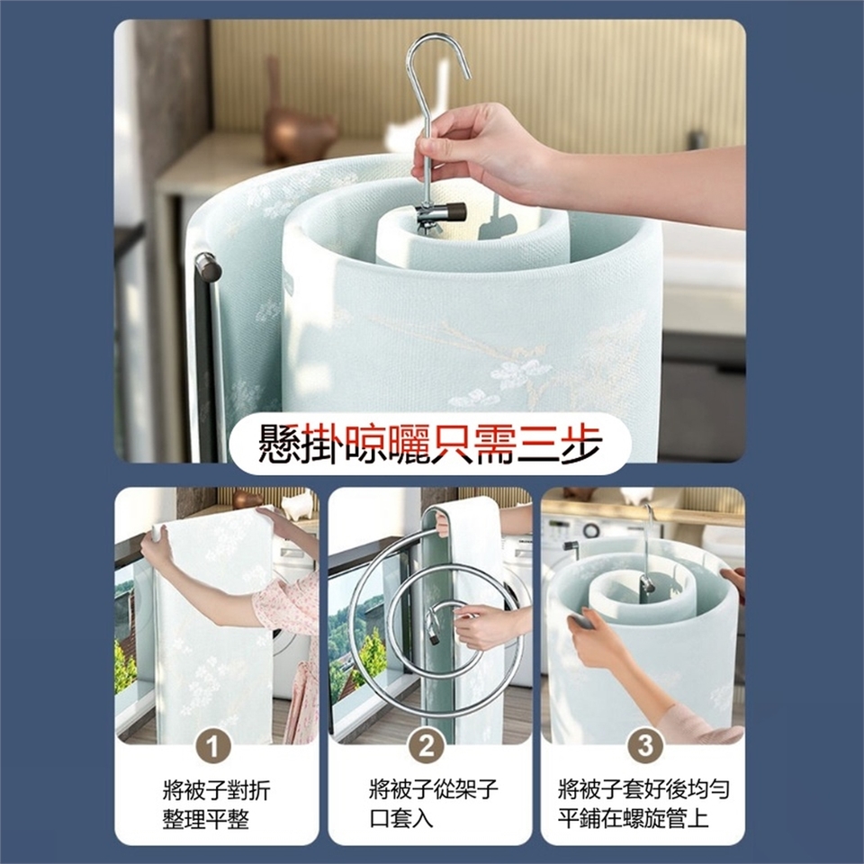 螺旋式設計,有效節省晾曬空間,360度全方位懸空通風,棉被均勻晾曬,透氣不潮濕,可拆卸折疊設計方便收納,加粗加厚鋼管,高承重力,不易變形,堅固耐用,噴速工藝,圓潤打磨,防鏽耐用