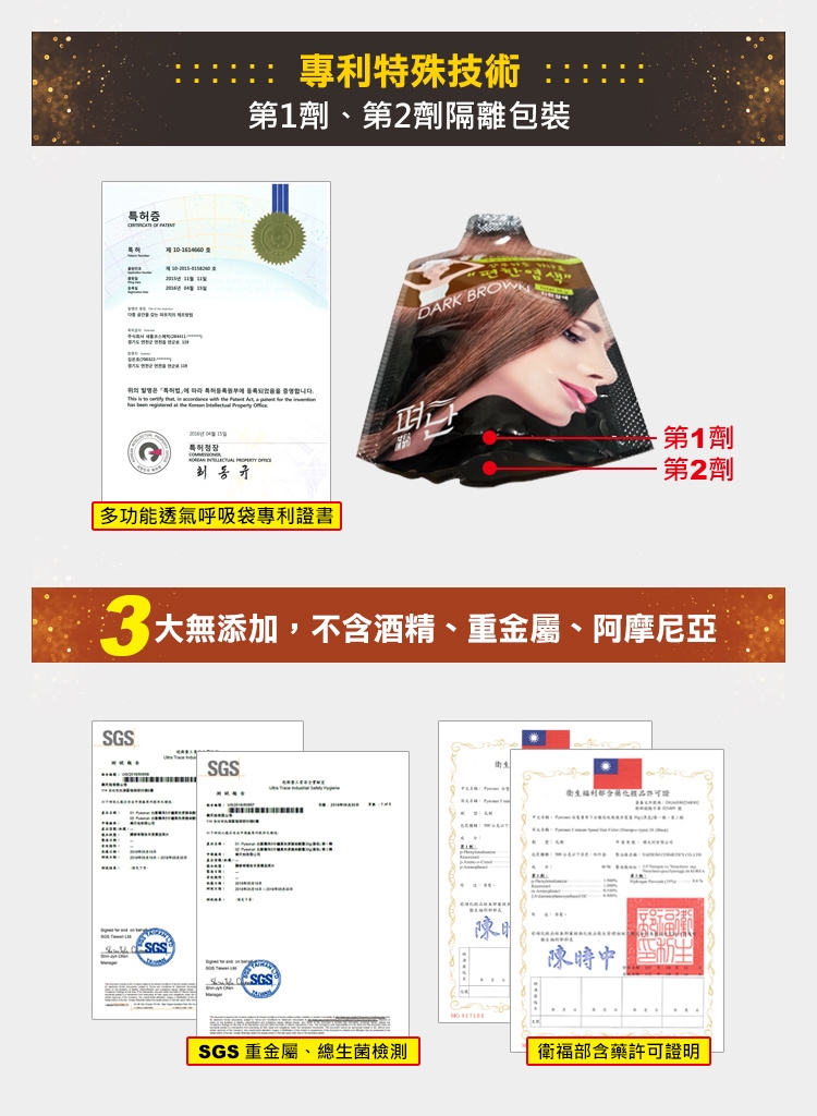 (二) 、染髮時應儘量避免染髮液沾到頭部或頸部皮膚,該部位若不慎沾到染髮液,請立刻用水沖洗、染髮劑不得使用於染眉毛、睫毛、鬍子或身體其他部位之毛髮。