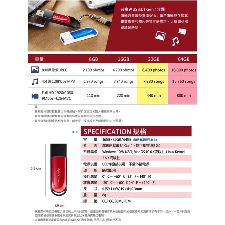 介面:超高速USB 3.1 Gen 1,向下相容USB 2.0