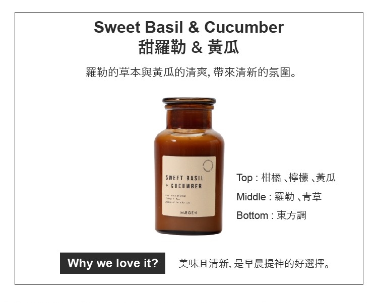 ●羅勒的草本甜味與黃瓜的清爽香氣結合,形成一種既能平靜又能提振精神的香氣。在室內帶來一絲大自然的氛圍,讓人聯想起夏日花園的感覺。