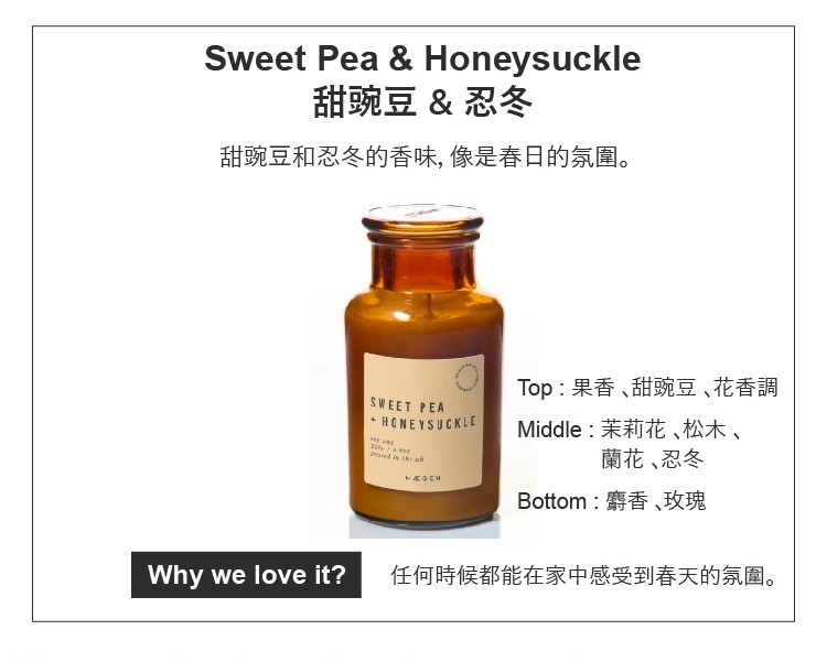 ●當甜豌豆和忍冬的香味交織在一起時,這股清新而芬芳的香氣,不僅能點亮空間,讓你感受到春日的脈動和美好。