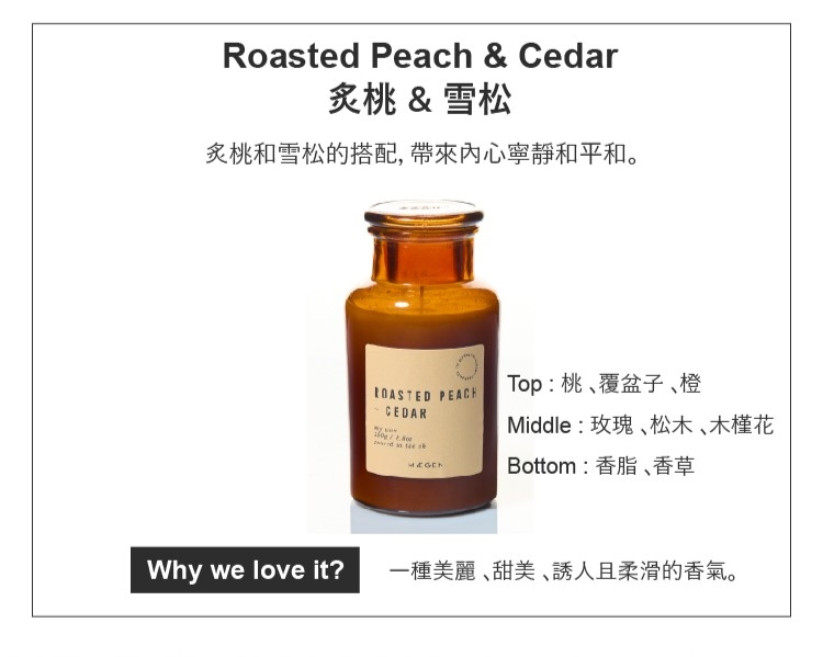 ●炙桃的香氣像是成熟夏日的味道,帶著微妙的甜美和溫暖,雪松的香味讓人放鬆身心,帶來內心的寧靜和平和。