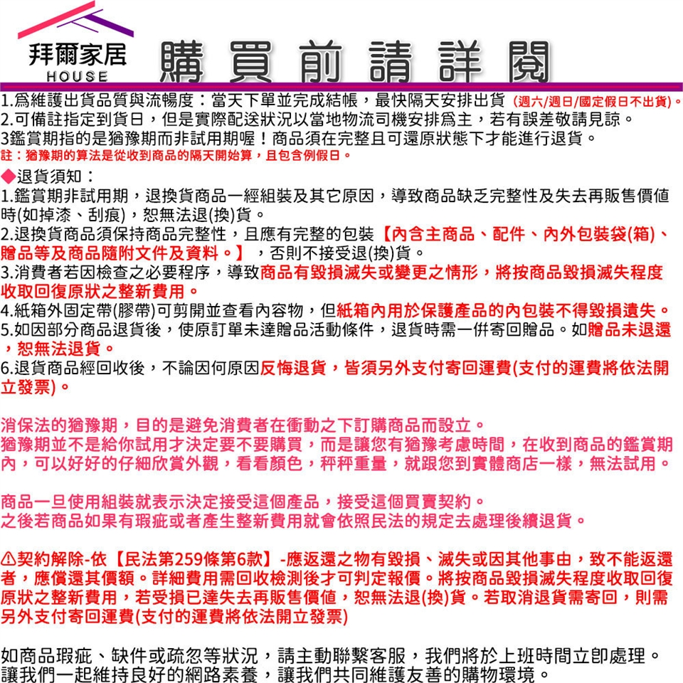 ⚠鑑賞期非試用期,退換貨商品一經組裝及其它原因,導致商品缺乏完整性及失去再販售價值時(如掉漆、刮痕),恕無法退(換)貨。