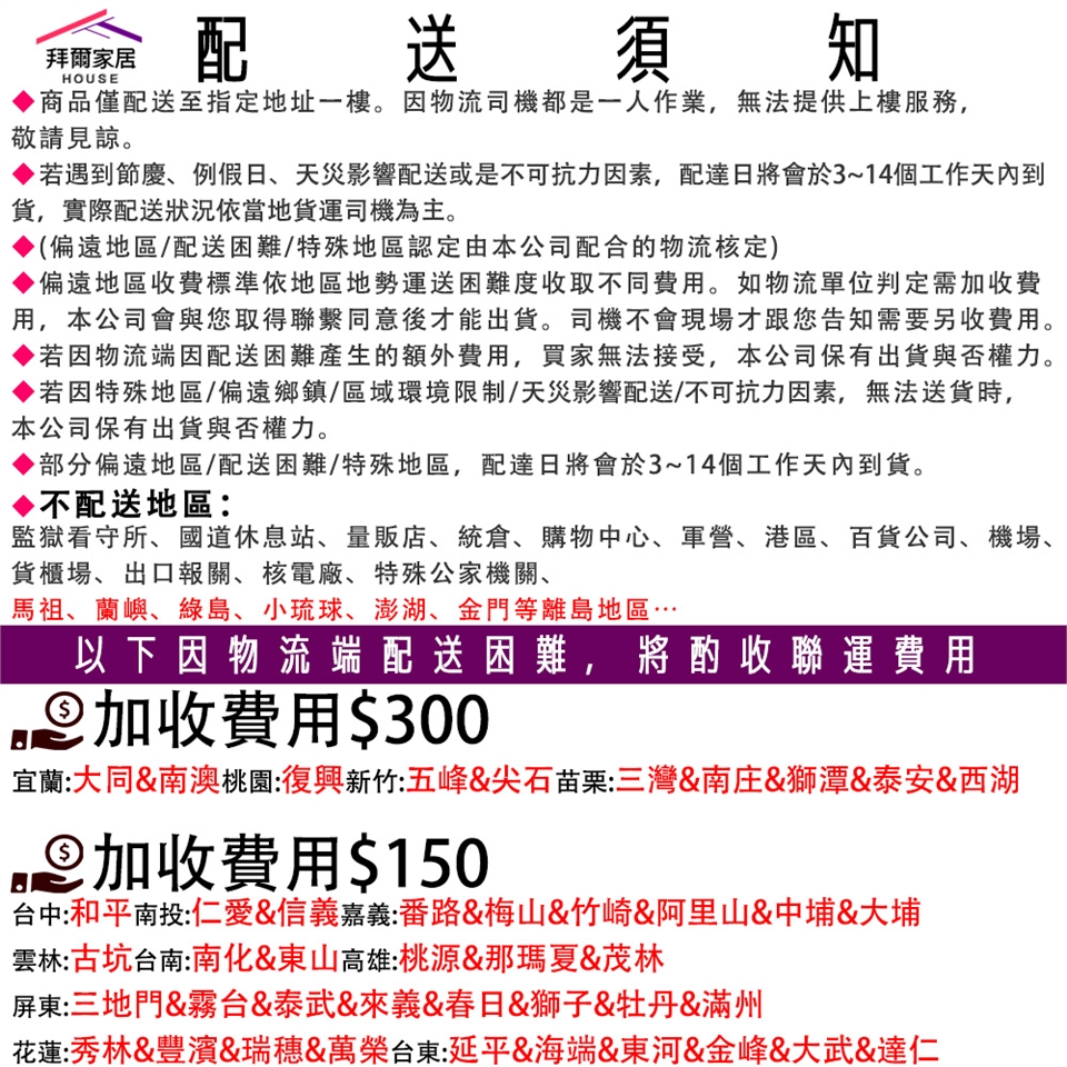 ⚠偏遠地區認定由本公司配合的物流核定,如需加收費用或無法配送,客服人員將會主動與您聯繫。
