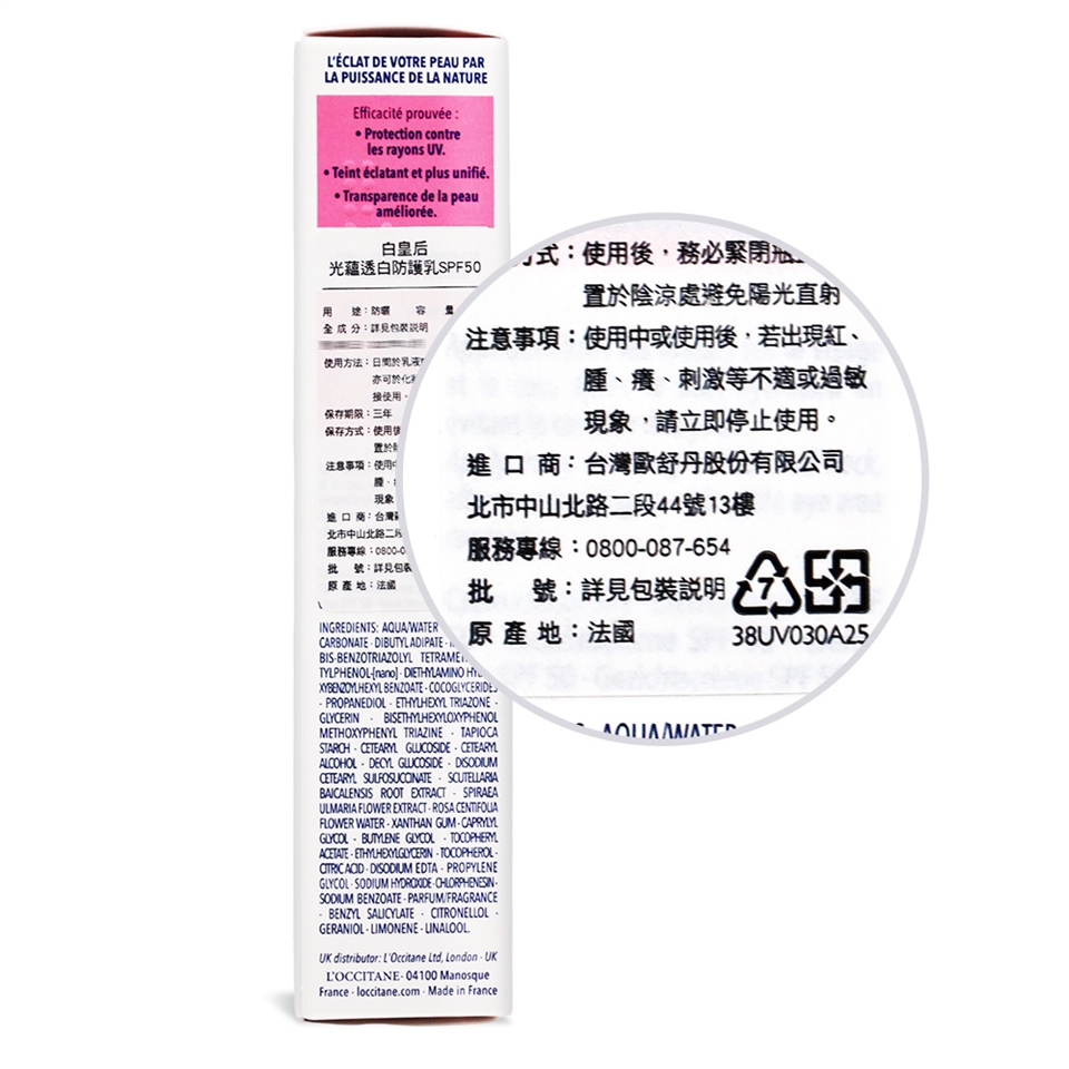 中文品名:L'OCCITANE 歐舒丹 白皇后光蘊透白防護乳SPF50(30ml)