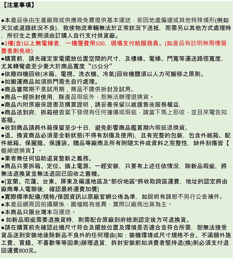 ◎ 本產品係由生產廠商或供應商免費提供基本運送,若因地處偏遠、或其他特殊情形 (例如:天災或道路狀況不良), 致使所屬物流車輛無法於正常狀況下送抵, 而需另以其他方式處理時,所衍生之費用,須由訂購人自行支付供貨廠商。