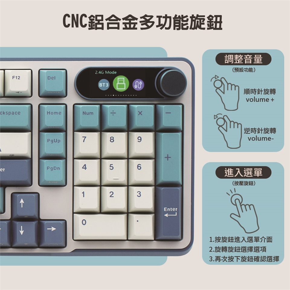 2. 短按旋鈕,鍵盤將切至2.4G連線,螢幕將顯示”2.4G連線中”,表示已進入連線狀態。