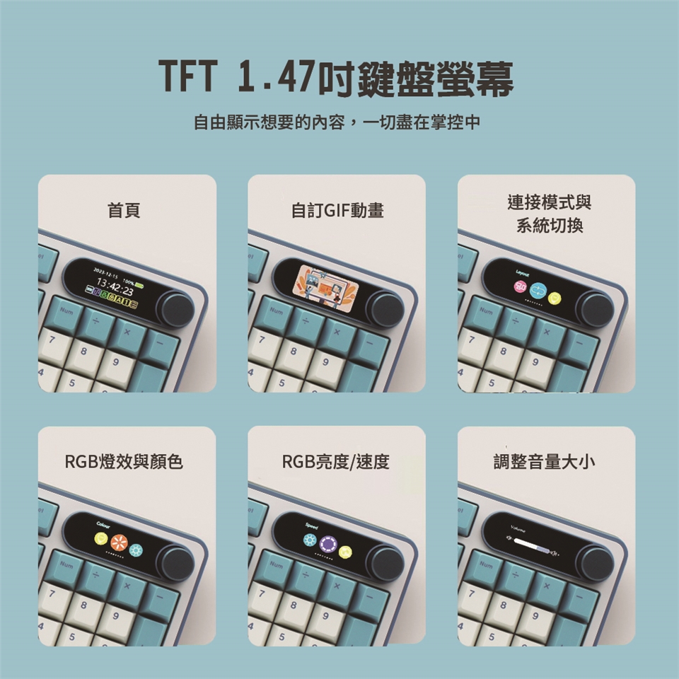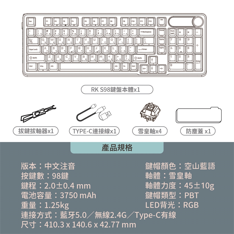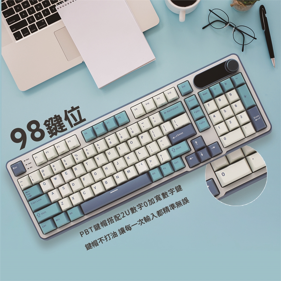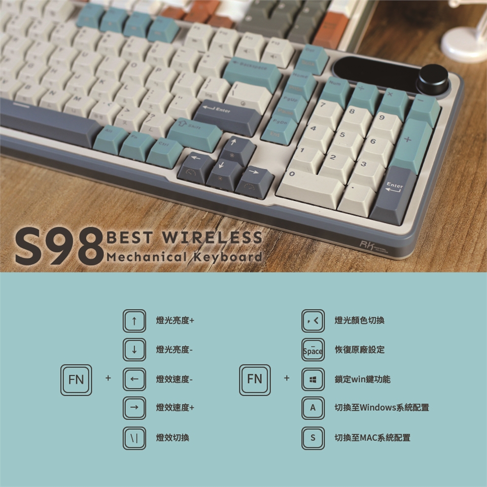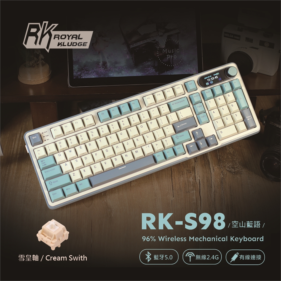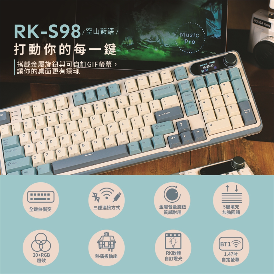 RK S98在96%配置,提供98鍵按鍵位設計,配有金屬材質旋鈕,以及可自訂gif動圖之小螢幕,給電腦桌面帶來嶄新使用情境。