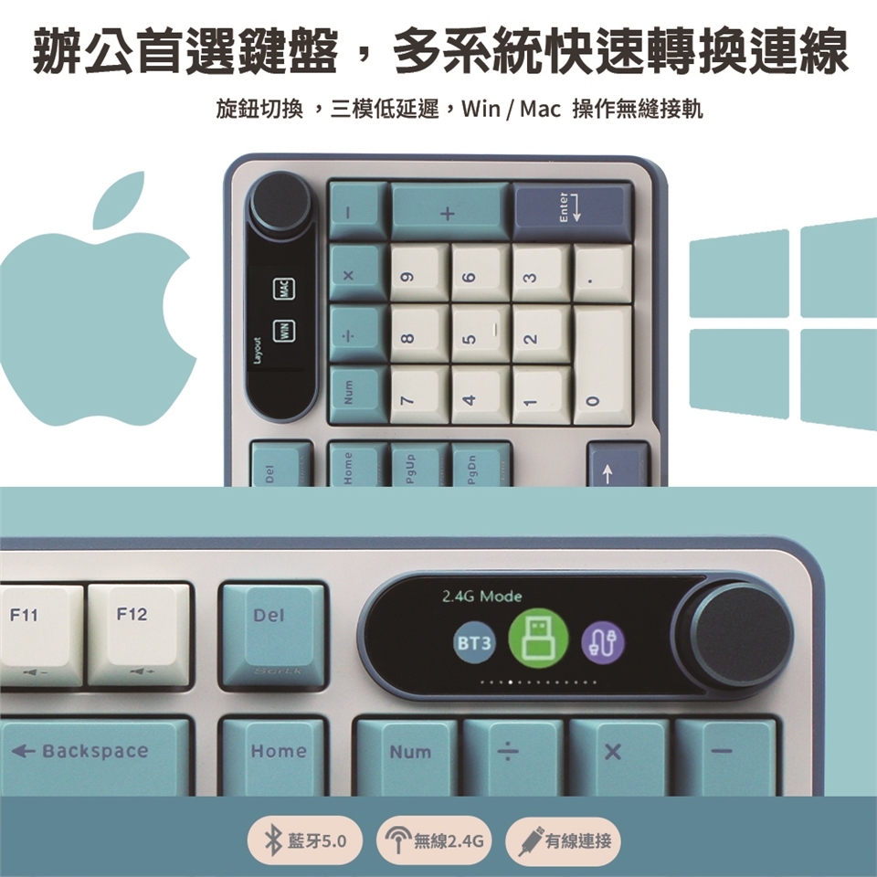 鍵盤支援藍牙、2.4G無線、TYPE-C有線連接,共3種連接方式,還可設定3台藍牙設備快速切換。支援自由切換Windows / Mac 雙系統,滿足各種的工作與跨平台操作需求。無論是出門攜帶,在家遊戲使用,低延遲2.4G、全鍵無衝突功能,滿足多樣化使用場景