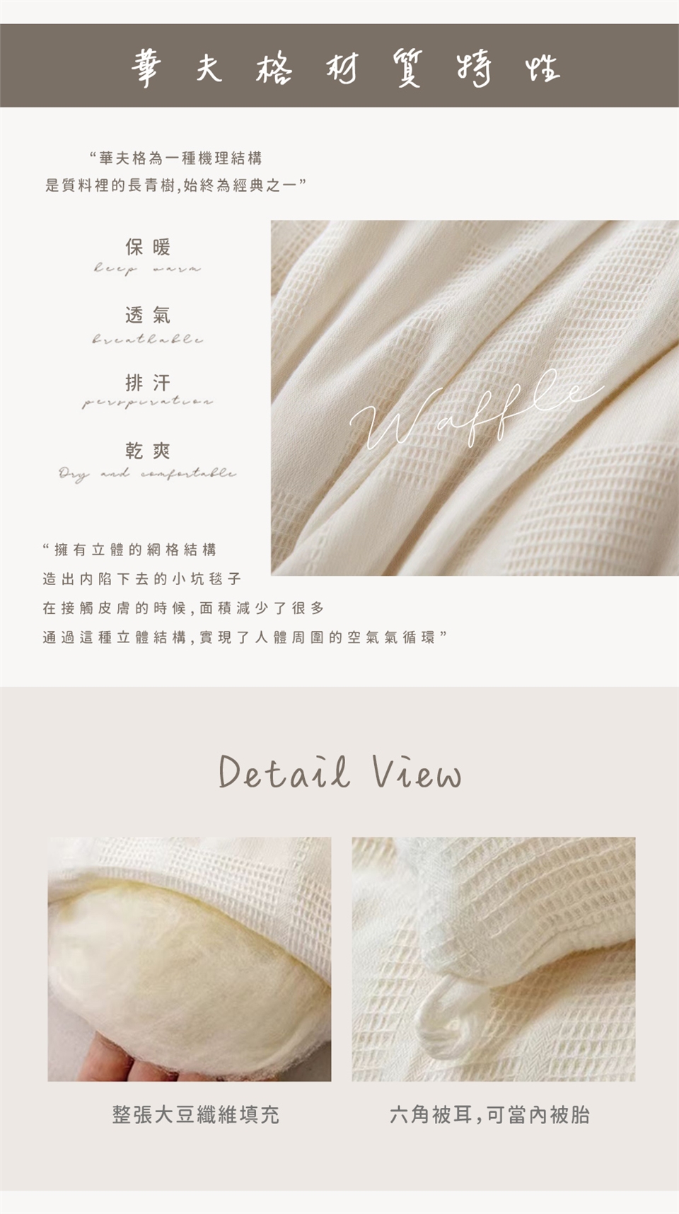 採用柔暖的華夫格質料, 擁有立體的網格狀結構, 營造出許多小空隙,減少了許多肌膚與薄毯接觸的面積, 讓人體周圍的空氣微循環以達到更透氣、排汗、乾爽的效果!