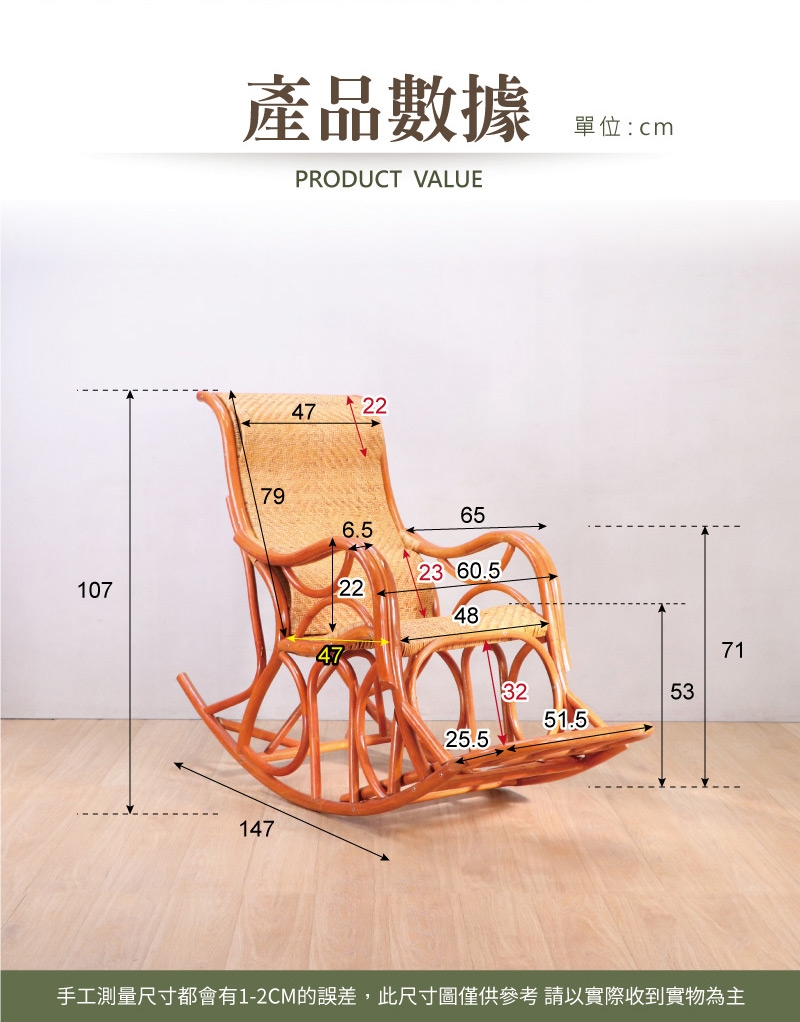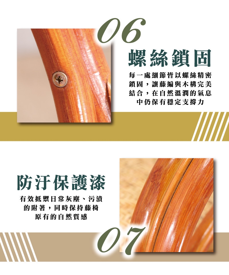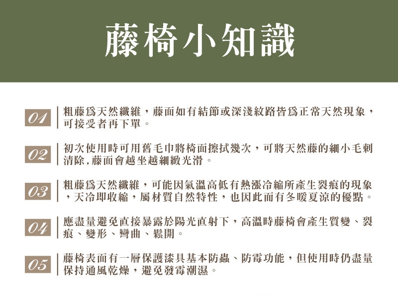 5. 藤椅表面有一層保護漆具基本防蟲、防霉功能,但使用時仍盡量保持通風乾燥,避免發霉潮濕。