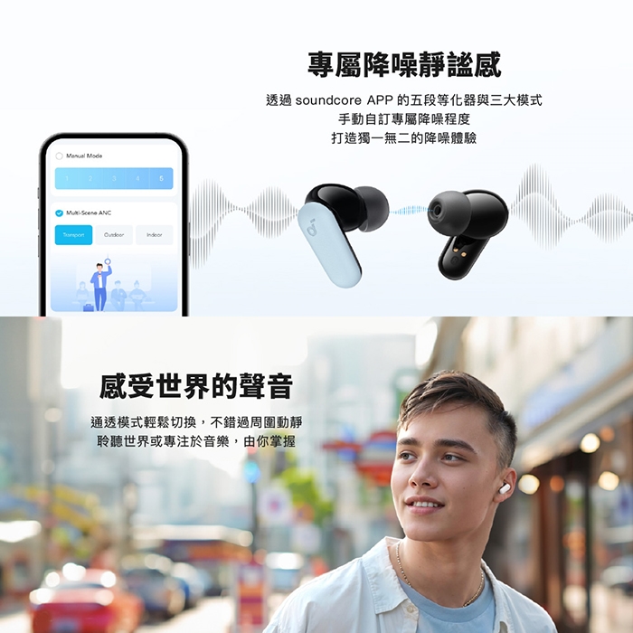 自動降噪 智慧偵測|自適應主動降噪,最多減少 -42dB 噪音,依照環境提供不同降噪效果
