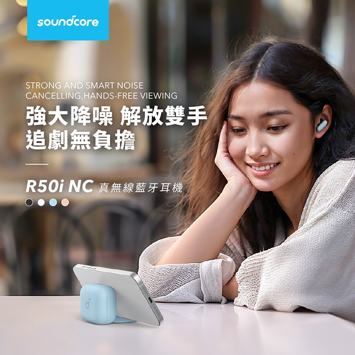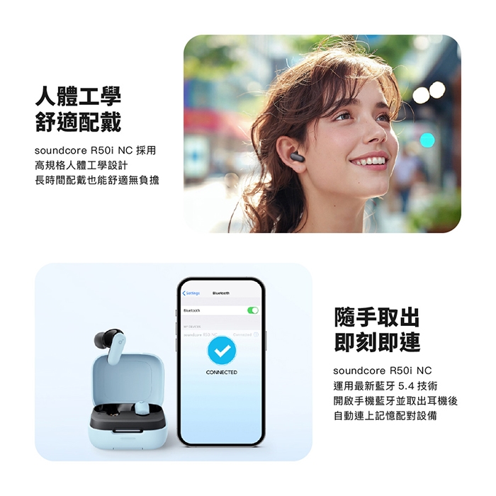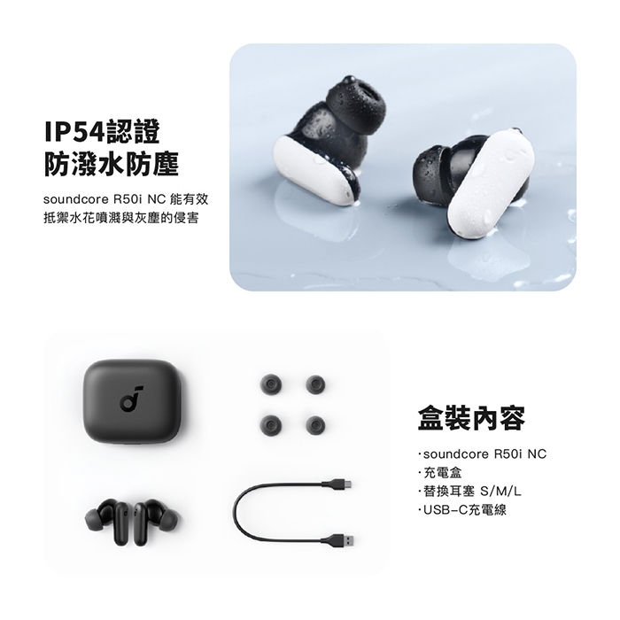 產品內容物:Soundcore R50i NC、USB-A to USB-C 充電線、替換耳塞S/M/L、說明書