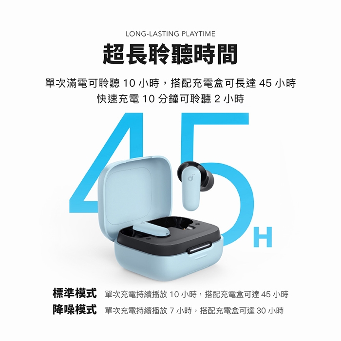 超長續航 跨日享樂|單次續航 10 小時,搭配充電盒最多 45 小時續航力,旅遊、出差絕佳伴侶