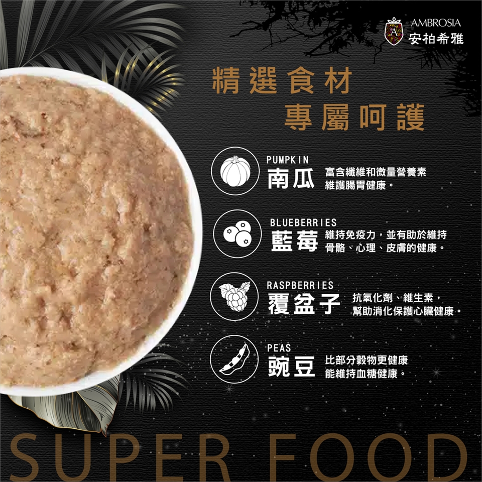 - 成分:雞肉(雞肉、雞肝、雞心)50%、鮭魚46%、豌豆、南瓜藍莓、覆盆子、鮭魚油、迷迭香礦物質、木糖。