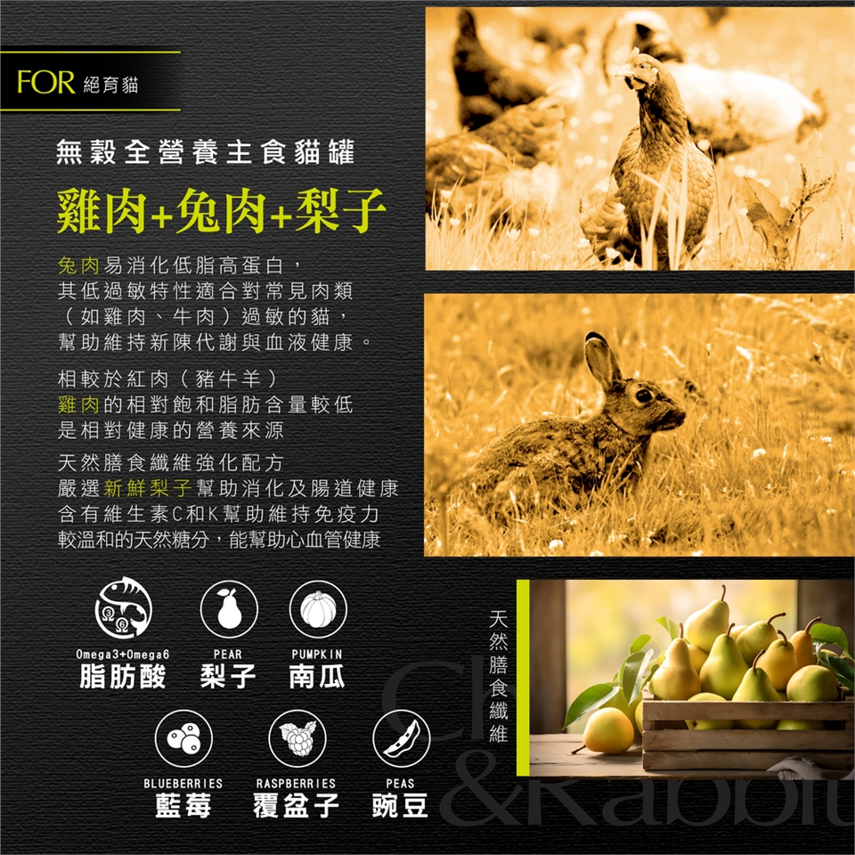- 特色:兔肉易消化低脂高蛋白,其低過敏特性適合對常見肉類(如雞肉、牛肉)過敏的貓,幫助維持新陳代謝與血液健康。相較於紅肉(豬牛羊),雞肉的相對飽和脂肪含量較低,是相對健康的營養來源。天然膳食纖維強化配方,嚴選新鮮梨子幫助消化及腸道健康,含有維生素C和K幫助維持免疫力,較溫和的天然糖分,能幫助心血管健康。