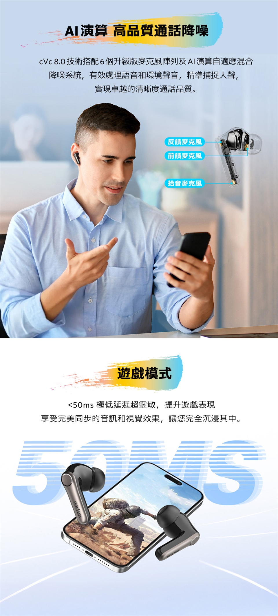- 通話降噪|AI演算+升級版6麥克風陣列+cVc 8.0技術