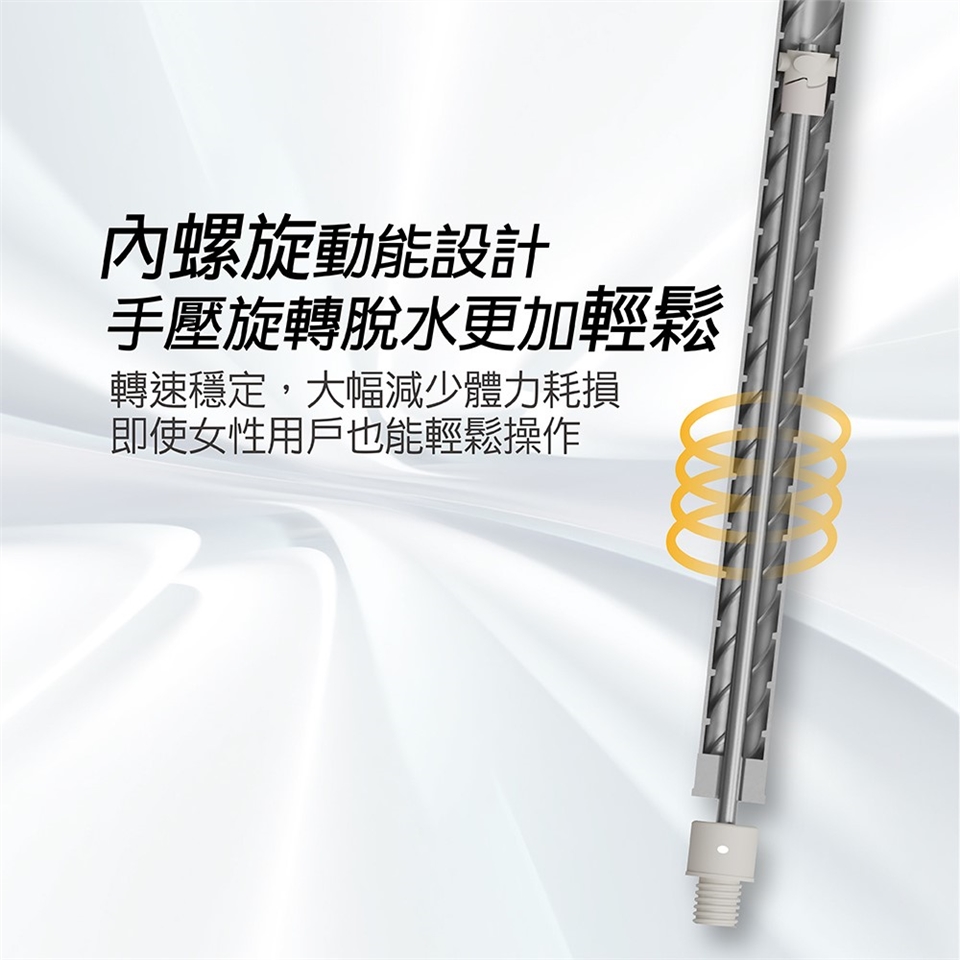 內螺旋結構設計:手壓旋轉脫水更輕鬆、轉速更穩定,大幅降低體力耗損,即使女性使用者也能輕鬆操作。