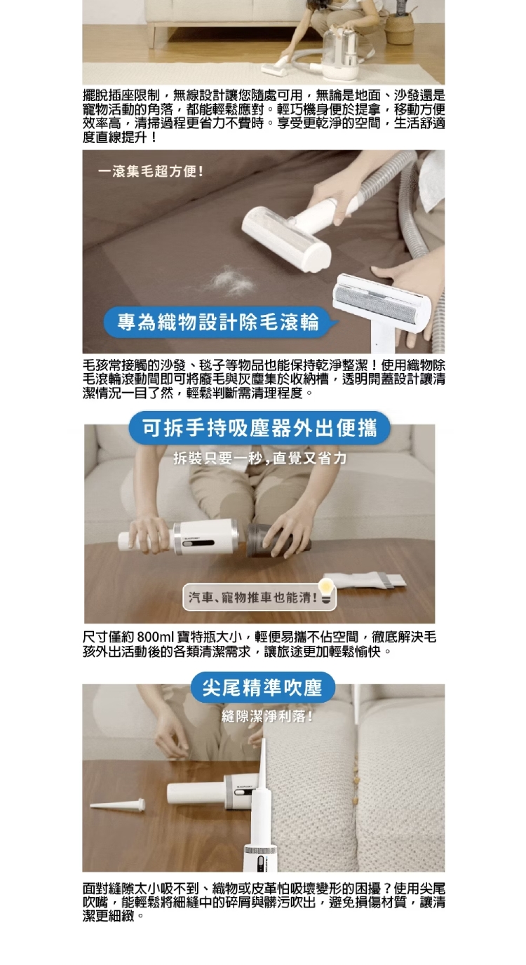 ◆ 二合一功能,寵物專用+手持吸塵器