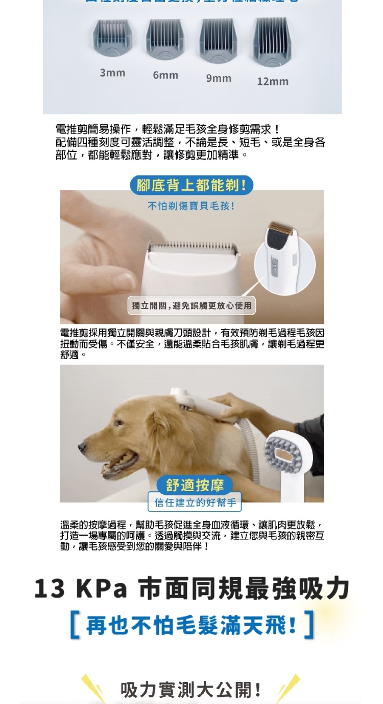 ◎ 配件: 扁吸、毛刷、USB充電線、靜電刷、針布梳、打薄梳、按摩梳、電動理髮器