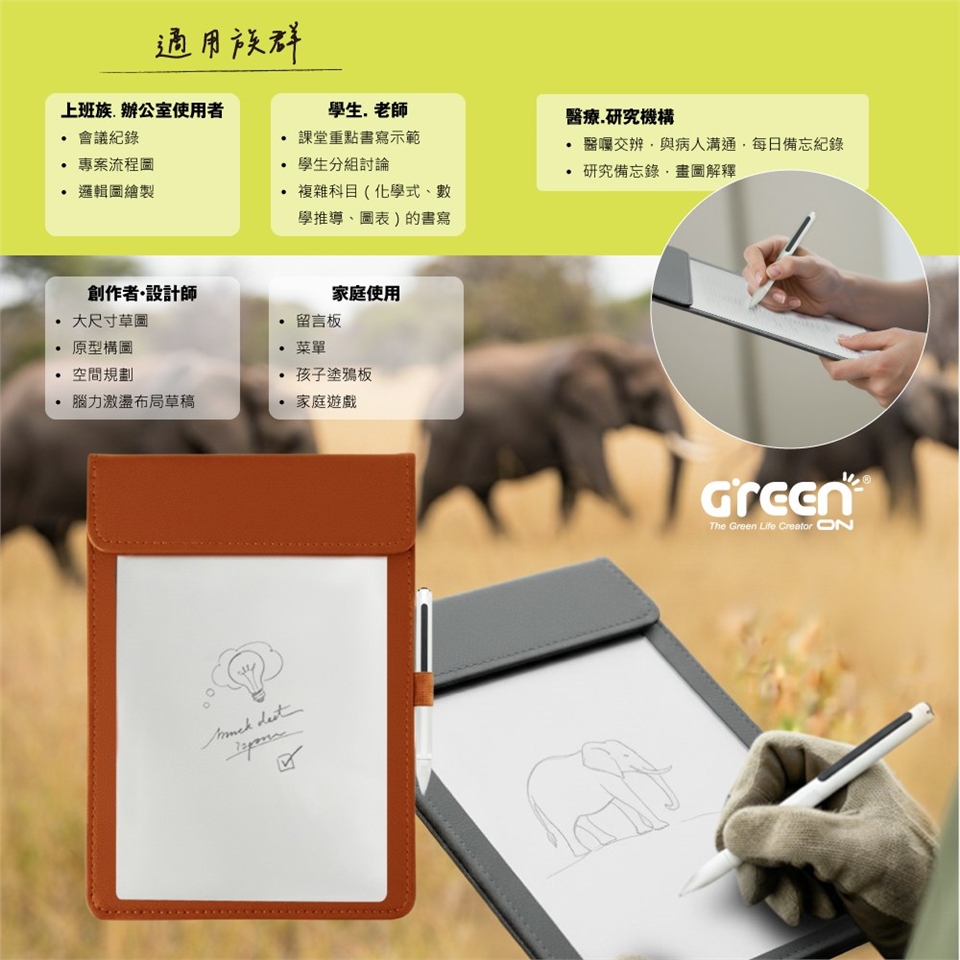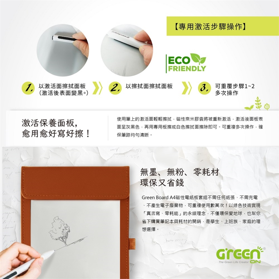 Green Board A4磁性電紙板不需任何紙張、不需充電、不產生電子廢棄物,可重複使用數萬次!以綠色技術實現「真書寫、零耗能」的永續理念,不僅環保愛地球,也幫你省下購買筆記本與耗材的開銷,是學生、上班族、家庭的理想選擇。