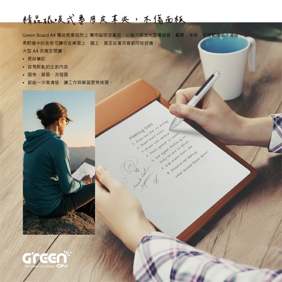 Green Board A4磁性電紙板套組附上專用磁吸皮革夾,以磁力固定大型電紙板,翻頁、手特、平放都穩固不滑移,柔韌適中的底板可讓你在桌面上、腿上、甚至站著書寫都同樣舒適。大型A4書寫空間讓長段筆記、容易散亂的企劃内容、圖表、草圖、流程圖 ,都能一次寫清楚,讓工作與學習更有條理。