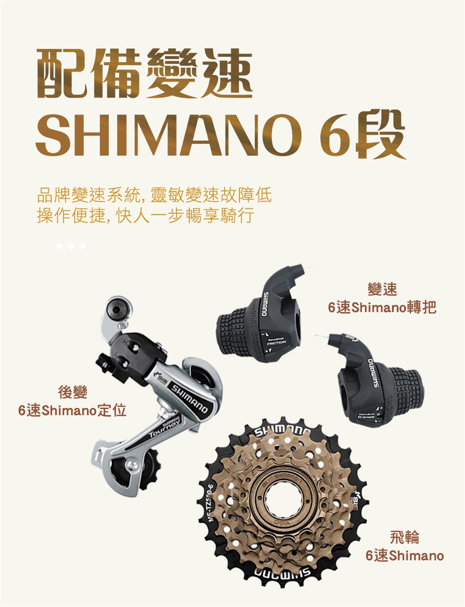 變速:SHIMANO 6段變速系統 (喜瑪諾6速轉把,一整套都是喜瑪諾配件)