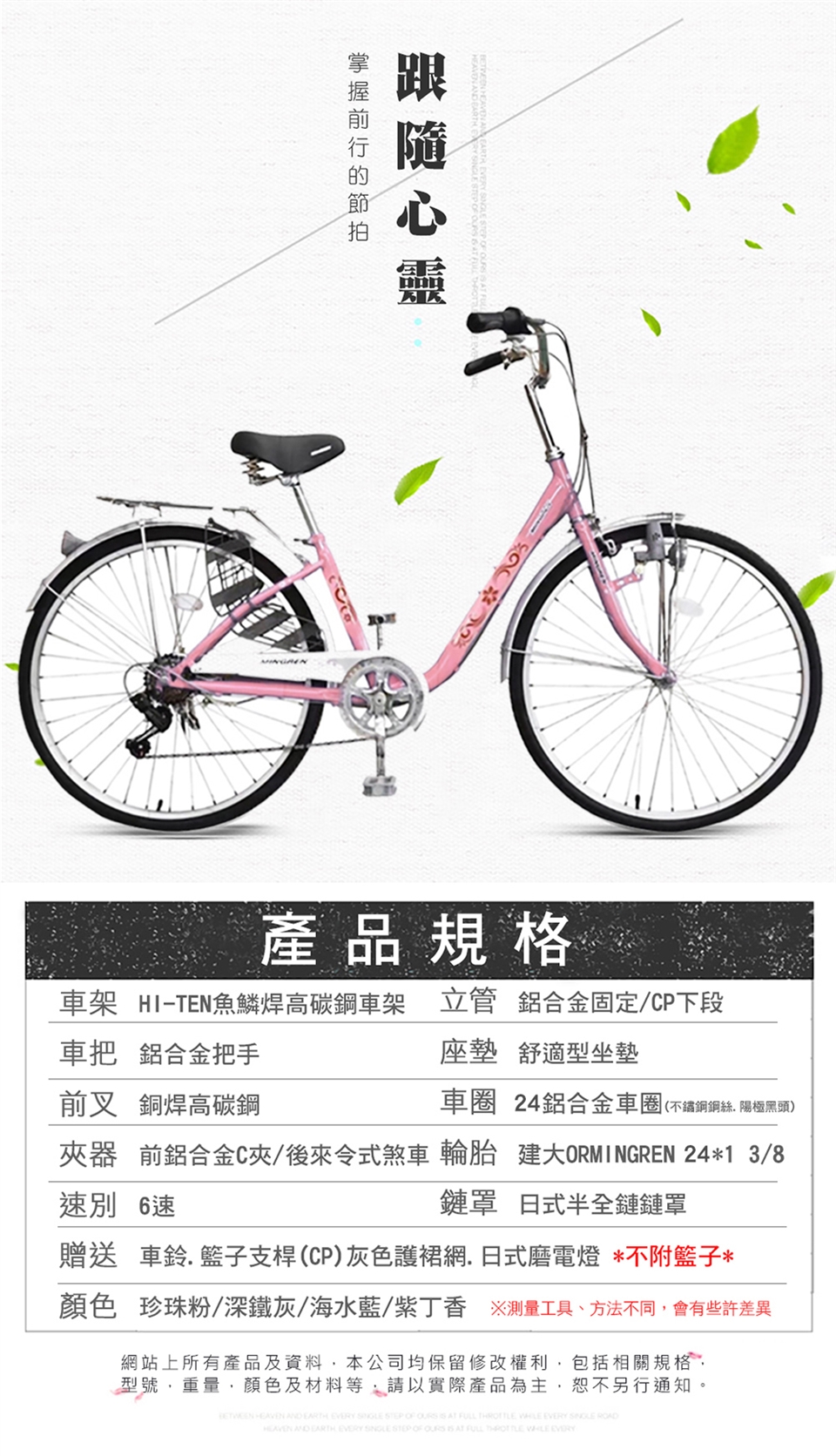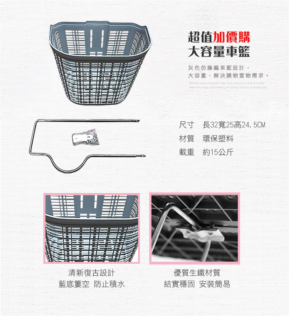 贈送:車鈴.籃子支桿(CP)灰色護裙網.日式磨電燈 *不附籃子*
