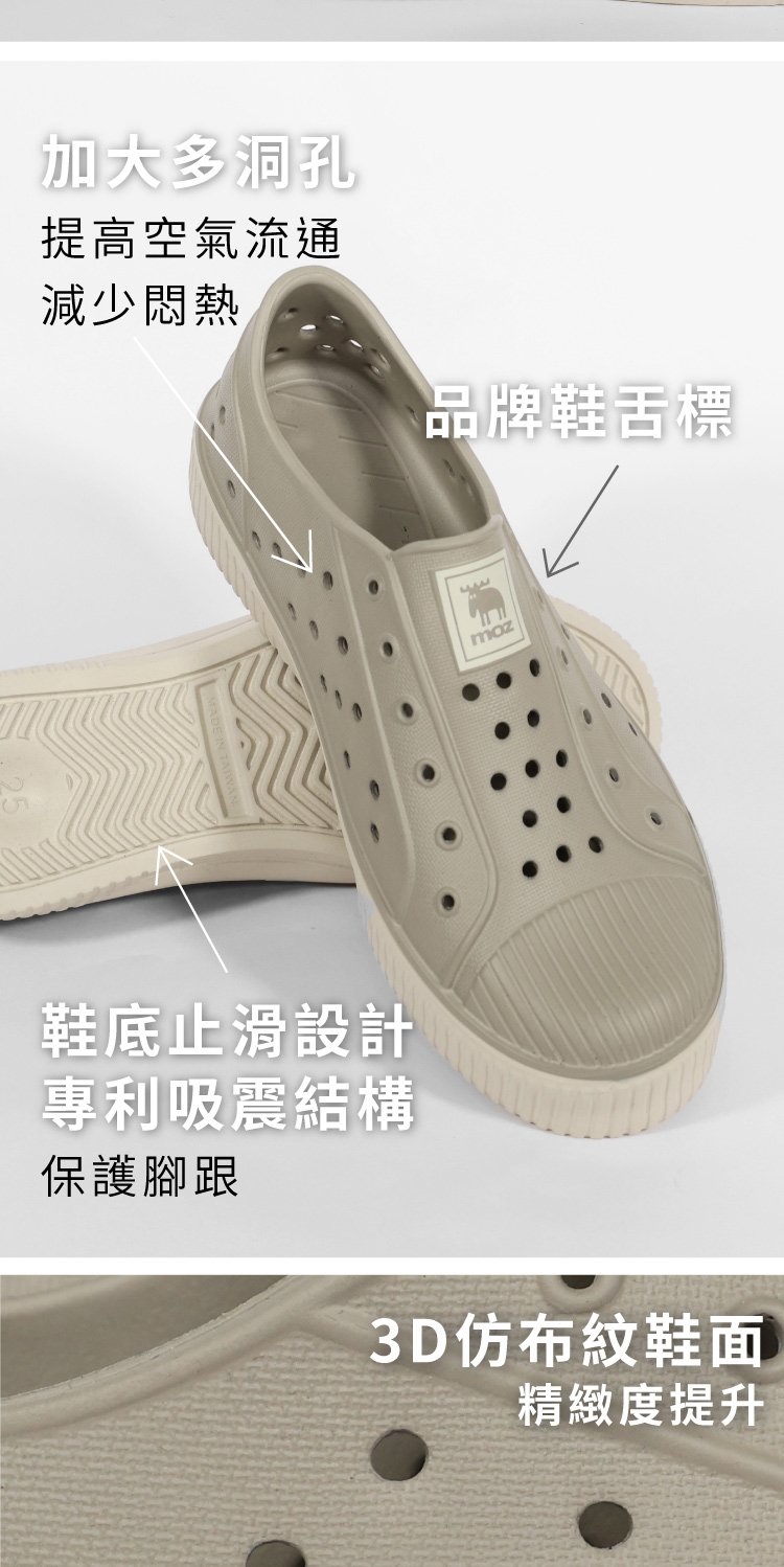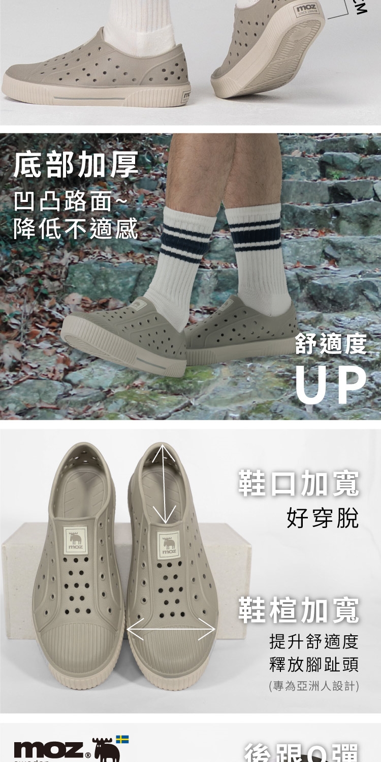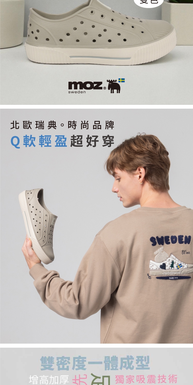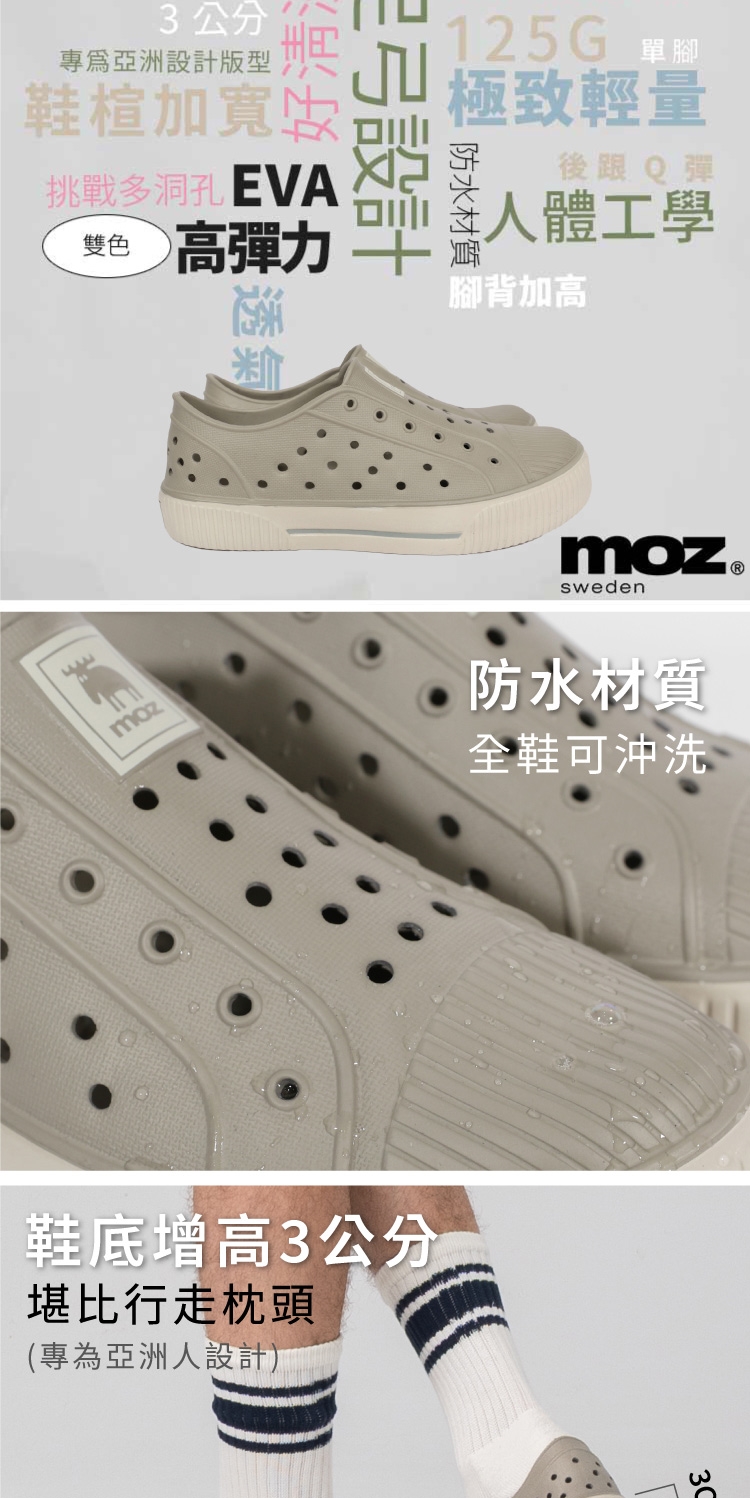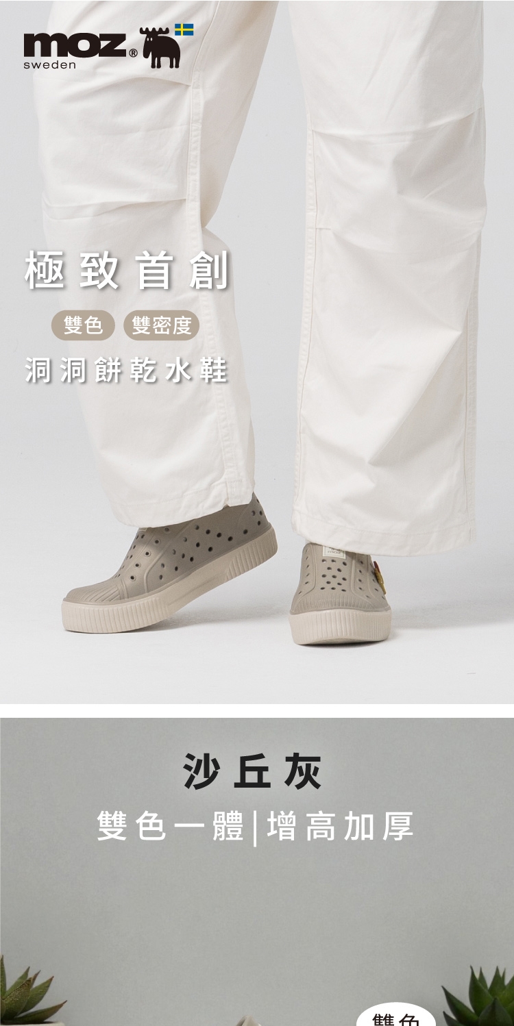想找一雙既輕盈又舒適的洞洞水鞋?moz瑞典駝鹿全球首創「餅乾水鞋」,嚴選日本UBE無毒EVA原料,僅125g超輕量,就像一杯冰淇淋的重量。3cm增高設計拉長腿部比例,加寬鞋楦和Q彈後跟不磨腳,久站、久走都能安心舒適。加大透氣洞孔,夏天穿也涼爽不悶熱,適合日常外出或防水使用。
