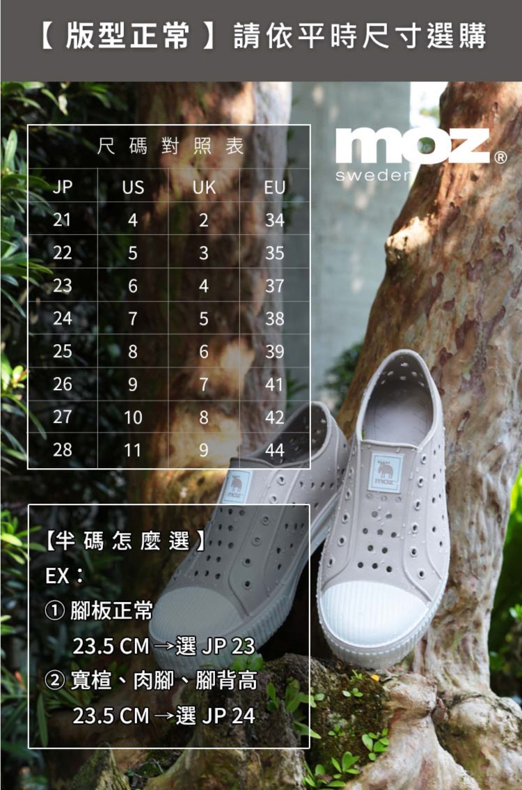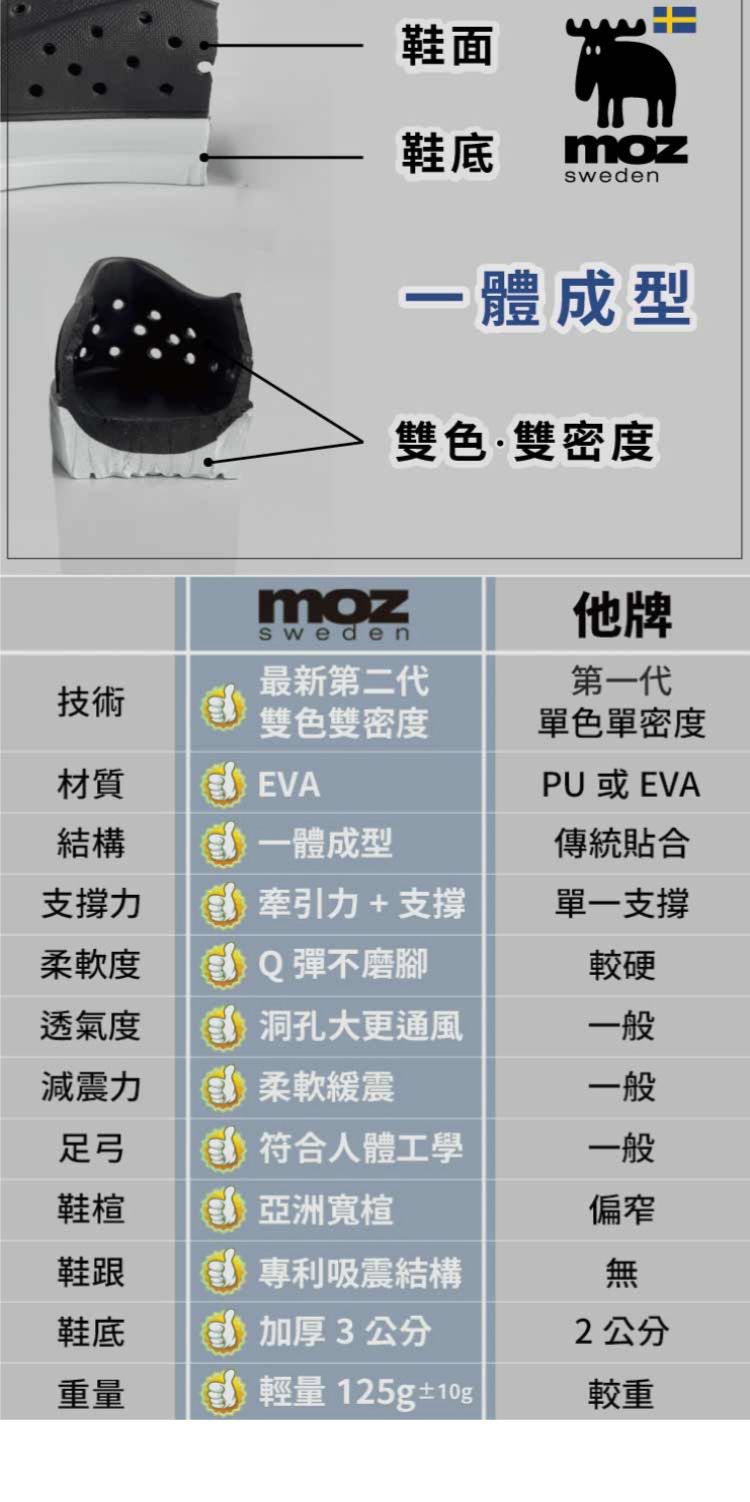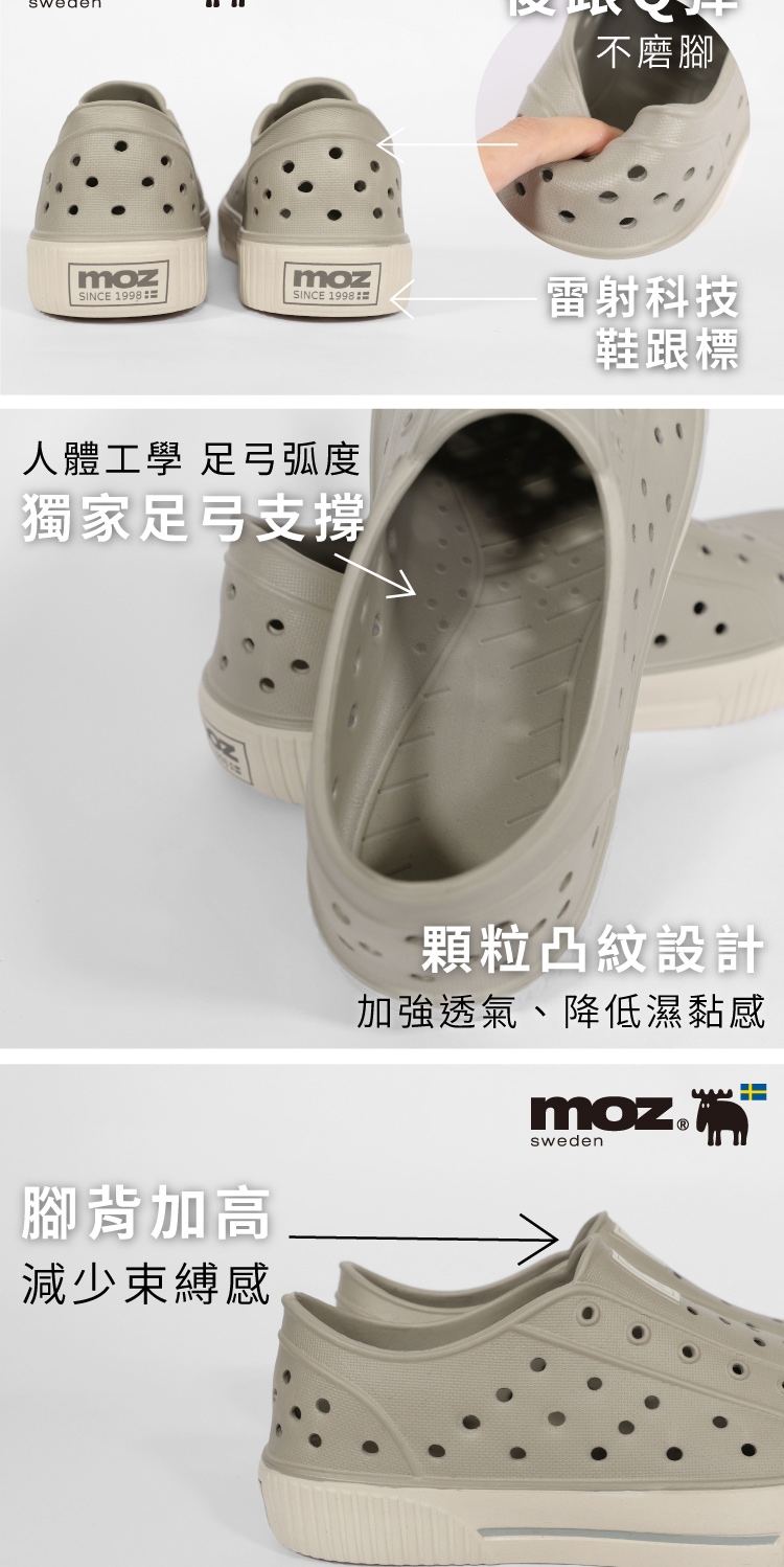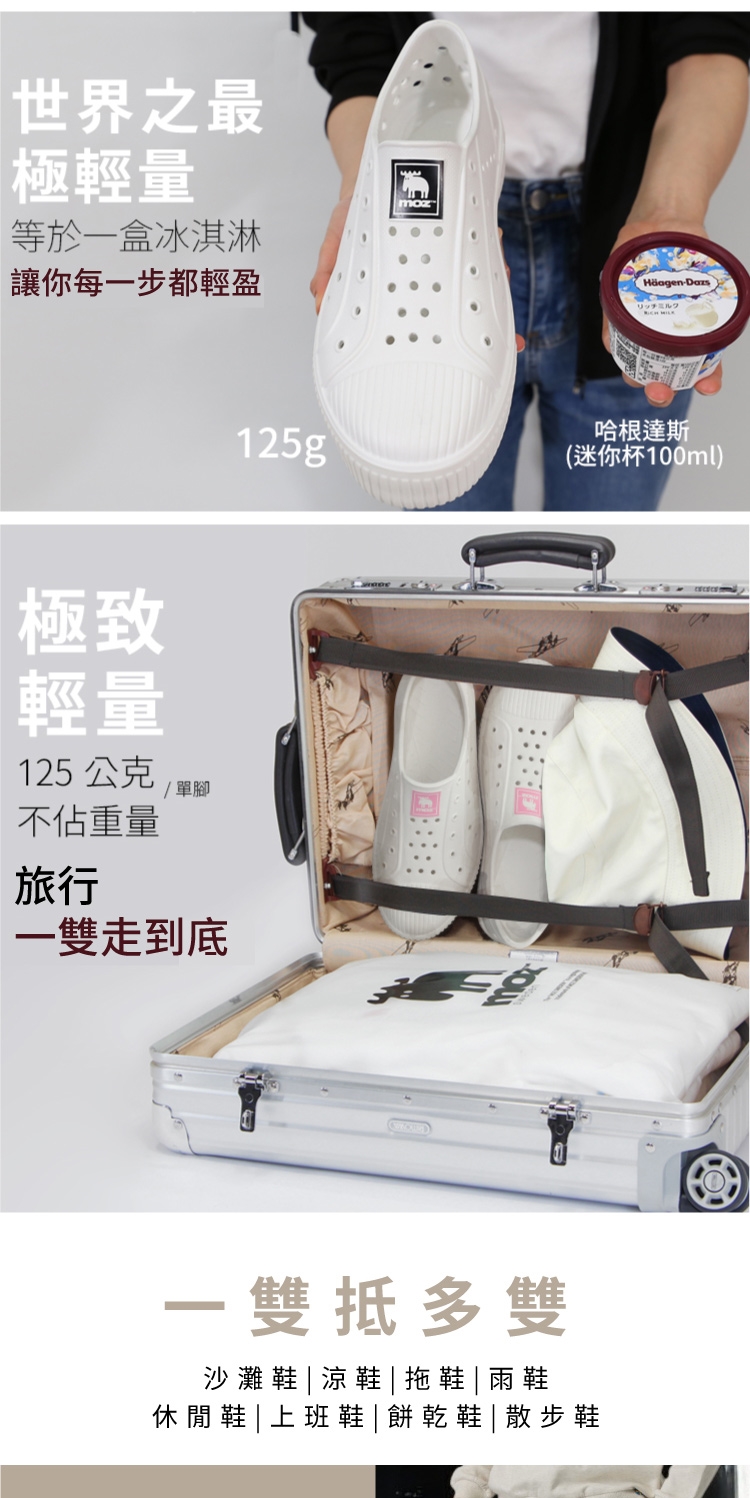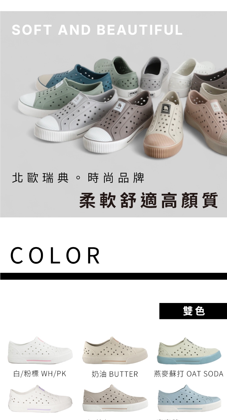 想找一雙既輕盈又舒適的洞洞水鞋?moz瑞典駝鹿全球首創「餅乾水鞋」,嚴選日本UBE無毒EVA原料,僅125g超輕量,就像一杯冰淇淋的重量。3cm增高設計拉長腿部比例,加寬鞋楦和Q彈後跟不磨腳,久站、久走都能安心舒適。加大透氣洞孔,夏天穿也涼爽不悶熱,適合日常外出或防水使用。