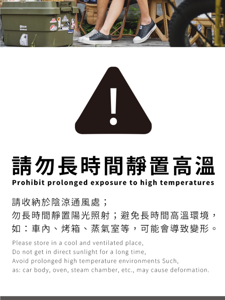 ※請收納於陰涼通風處,勿長時間靜置陽光照射;避免長時間高溫環境, 如:車內、烘乾機、烤箱、蒸氣室等,可能會導致變形。