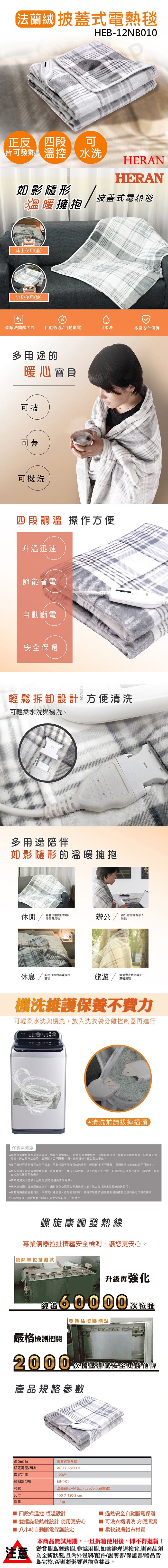 【禾聯HERAN】披蓋式法蘭絨電熱毯 HEB-12NB010