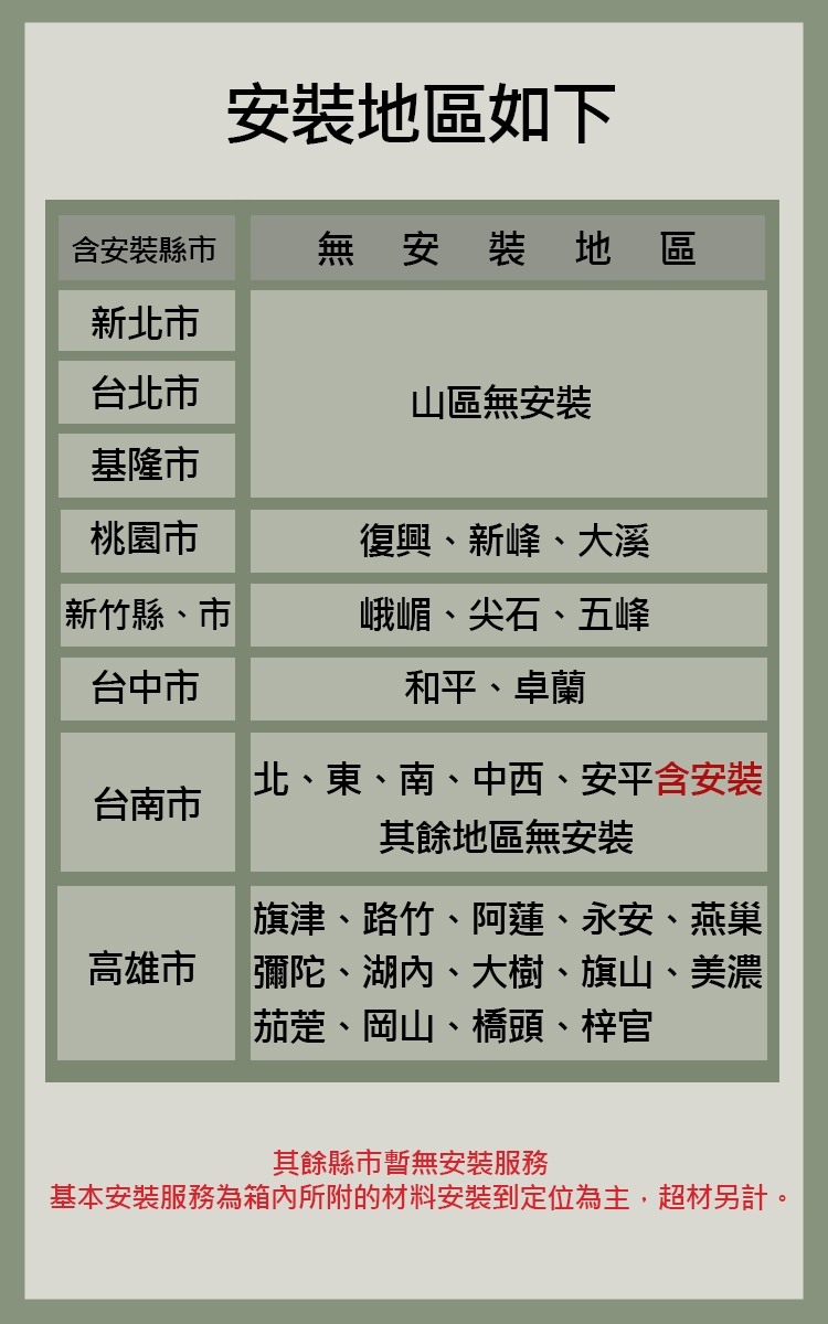 新北市、台北市、基隆市、桃園市、新竹市、台中市、台南市、高雄市市區含標準基本安裝及運送