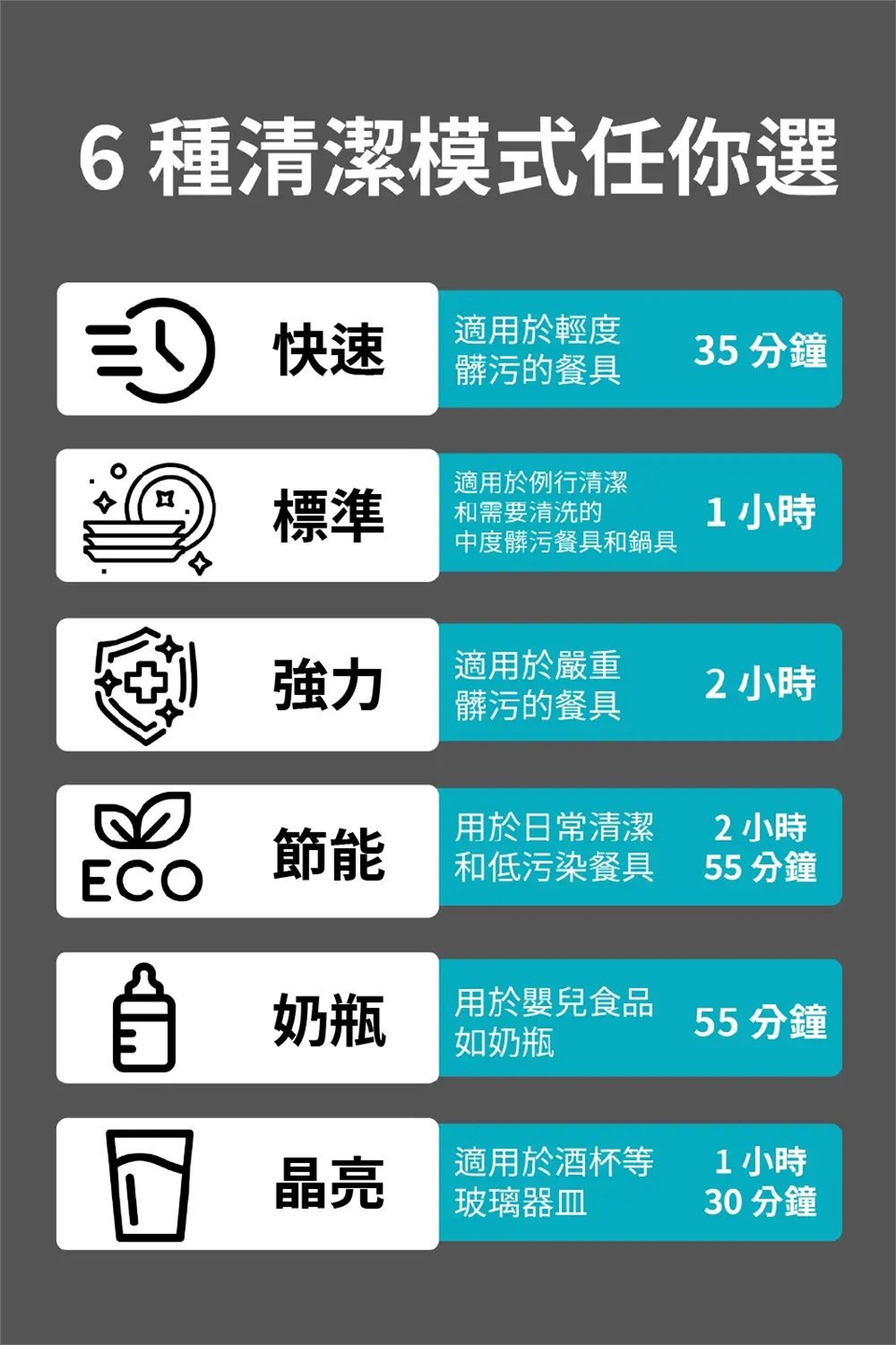 5. 貼心6大洗程,雙噴臂強力沖洗,無論輕重污垢都能徹底潔淨!