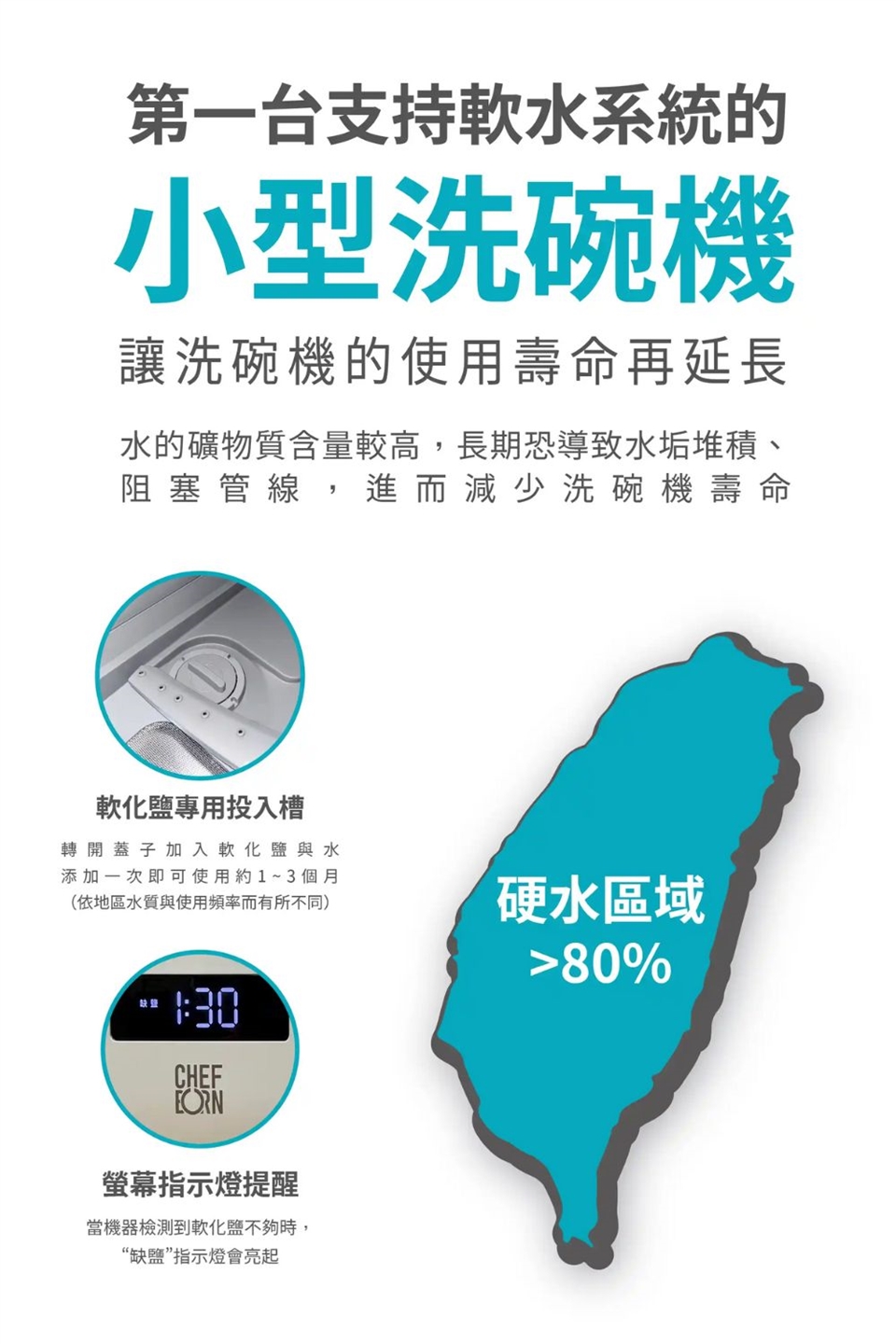 4. 唯一支持軟化鹽的小型洗碗機,台灣水質的最佳選擇!