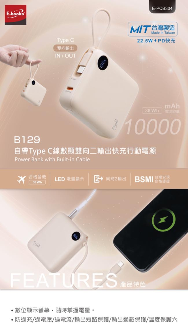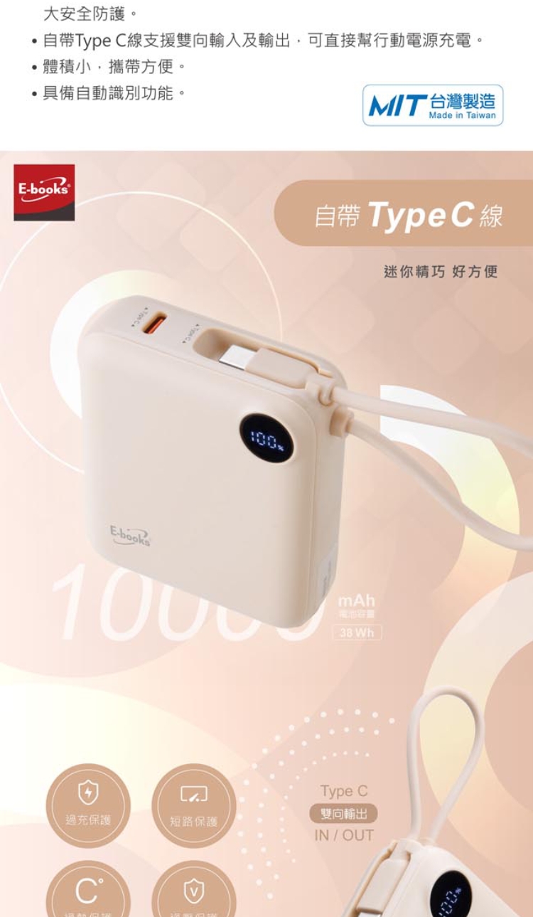 ◆ 自帶Type C線支援雙向輸入及輸出,可直接幫行動電源充電