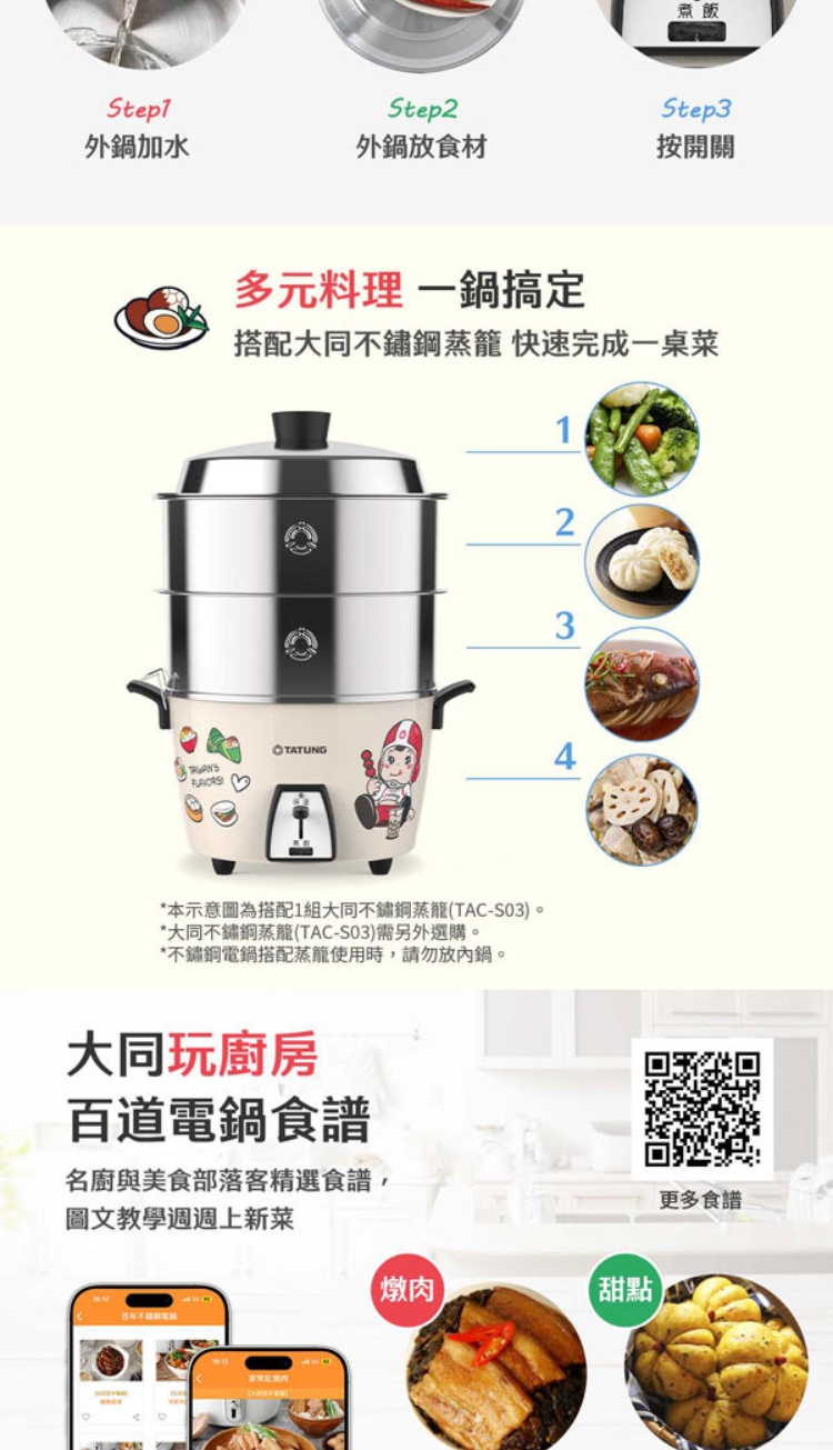 ★ 多元料理,煮飯/粥、蒸、滷、燉多用途